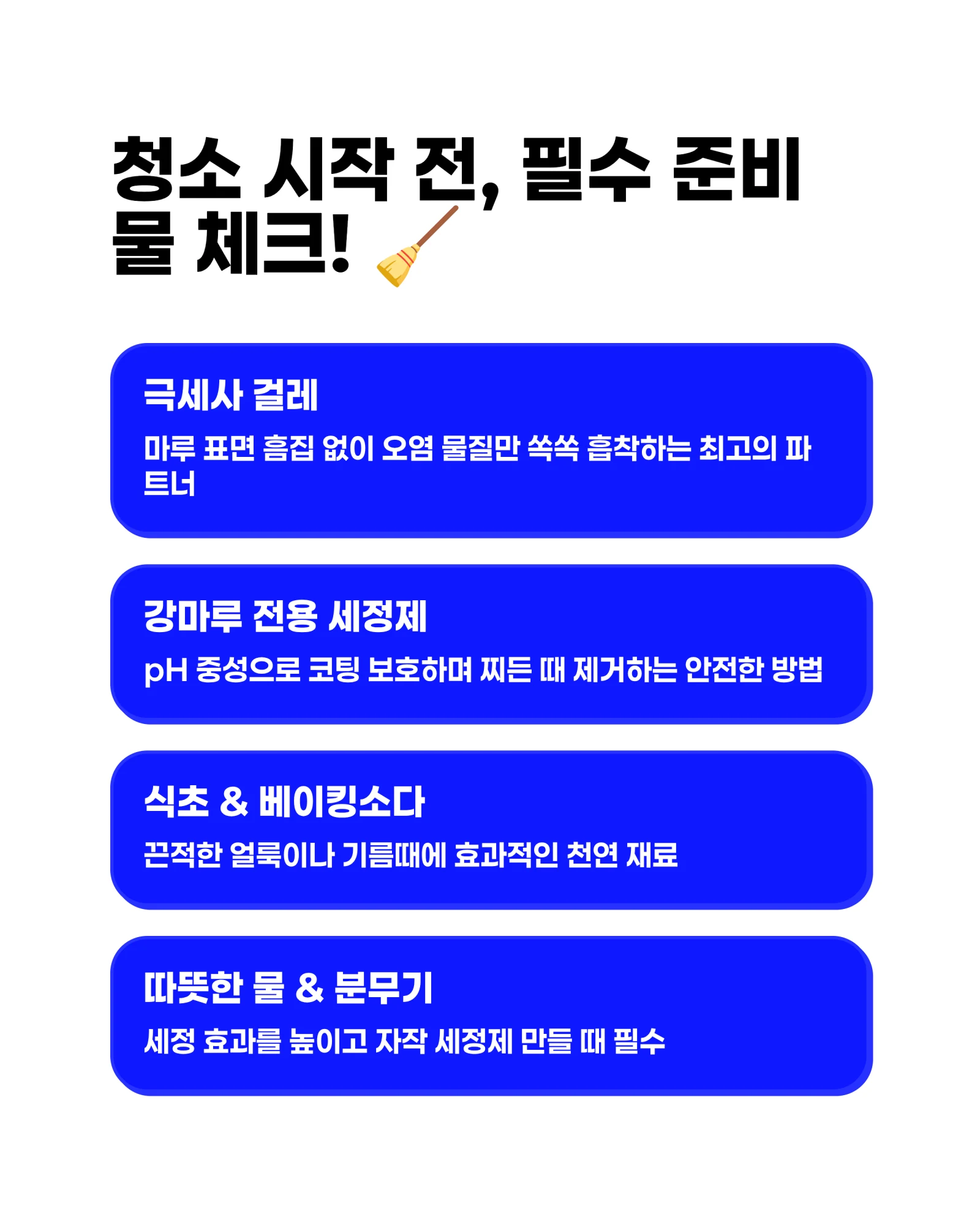 본격적인 청소에 앞서, 마루를 보호하고 청소 효과를 최대로 끌어올릴 준비물부터 챙겨볼까요? 생각보다 간단하답니다.