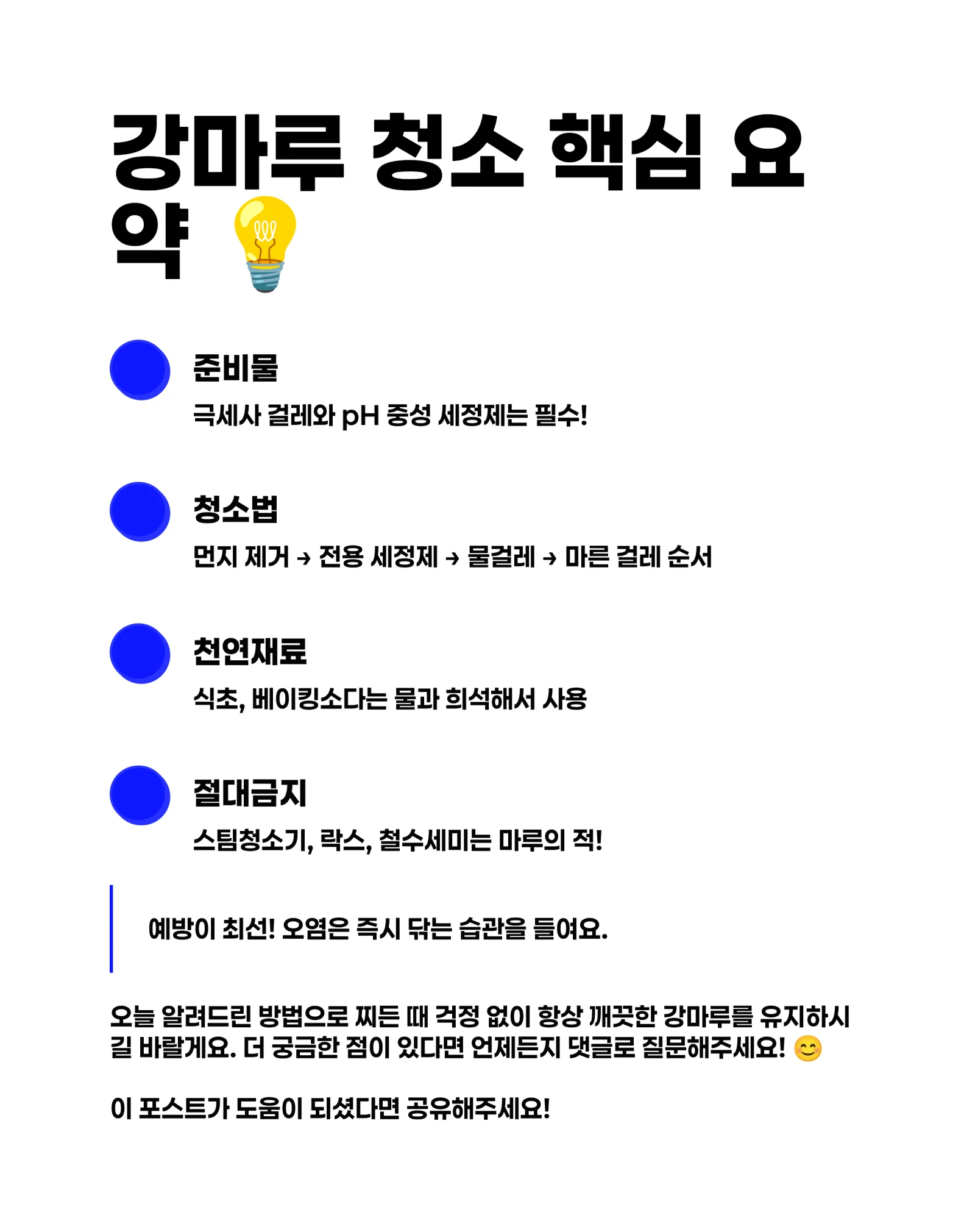 오늘 알려드린 방법으로 찌든 때 걱정 없이 항상 깨끗한 강마루를 유지하시길 바랄게요. 더 궁금한 점이 있다면 언제든지 댓글로 질문해주세요! 😊
