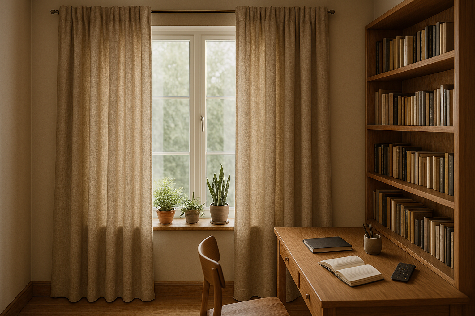 두꺼운 베이지 린넨 커튼으로 꾸민 차분한 서재 공간