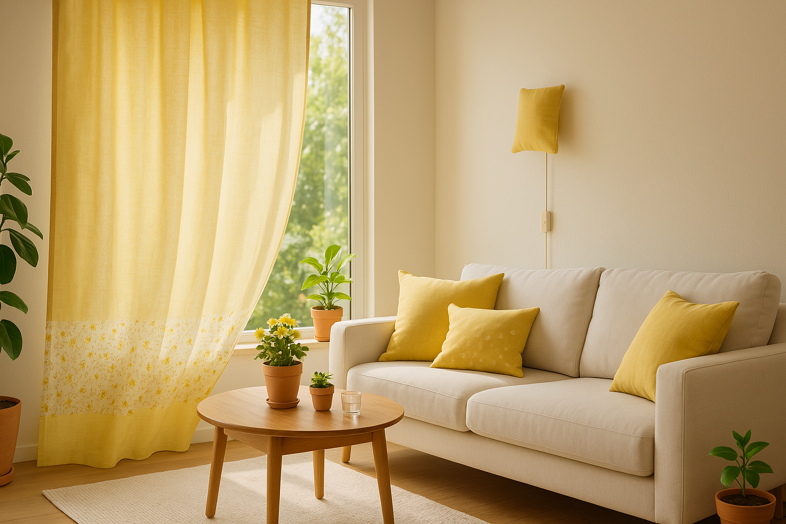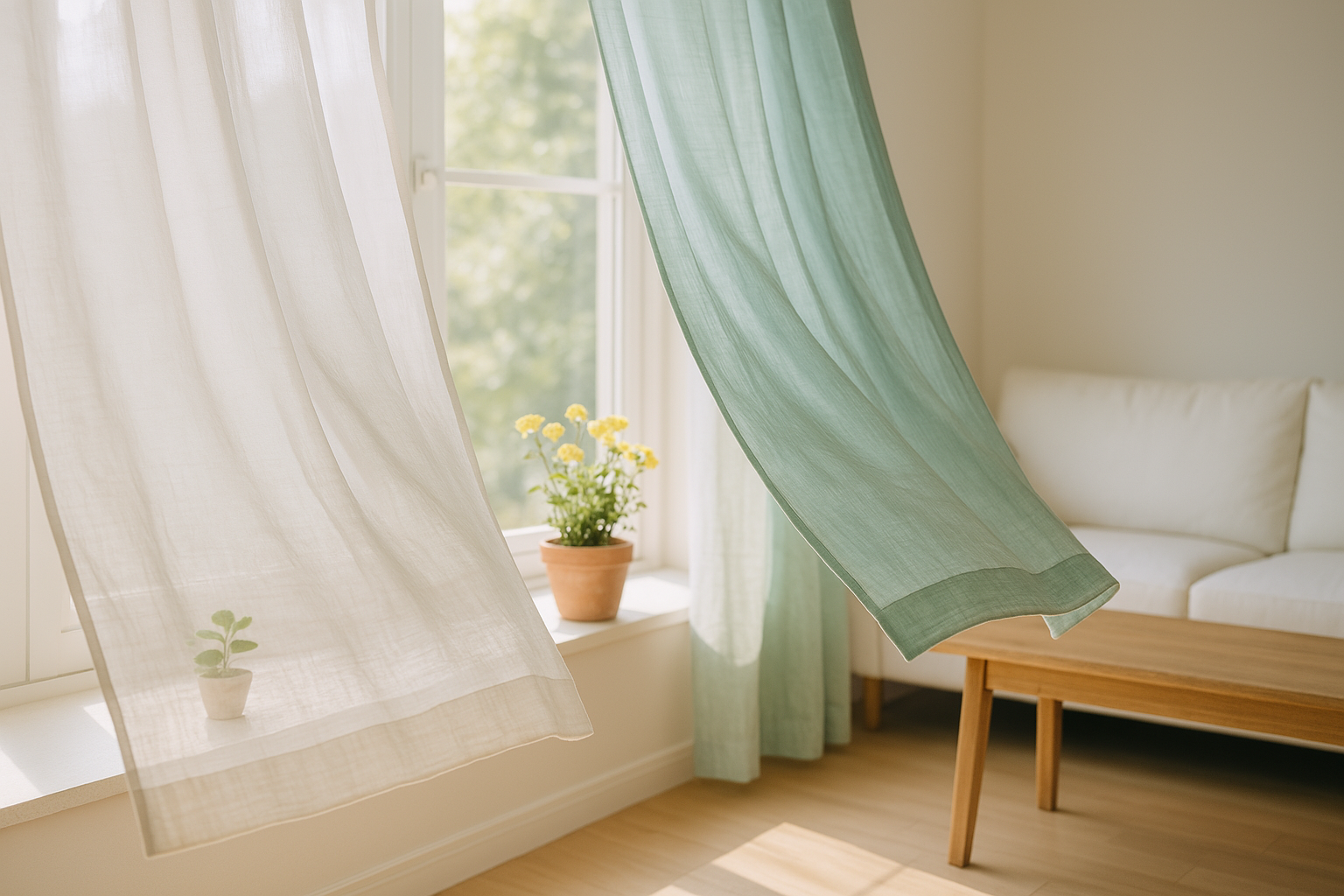 봄 햇살이 들어오는 거실의 화사한 린넨 커튼과 미니멀 인테리어