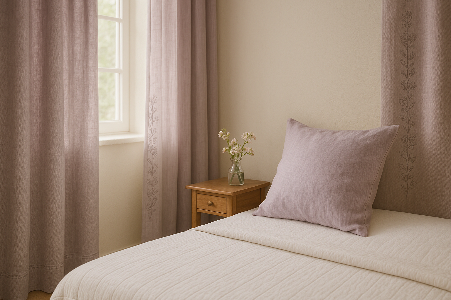 파스텔 라벤더 자수 커튼과 침구가 조화를 이루는 아늑한 봄 침실