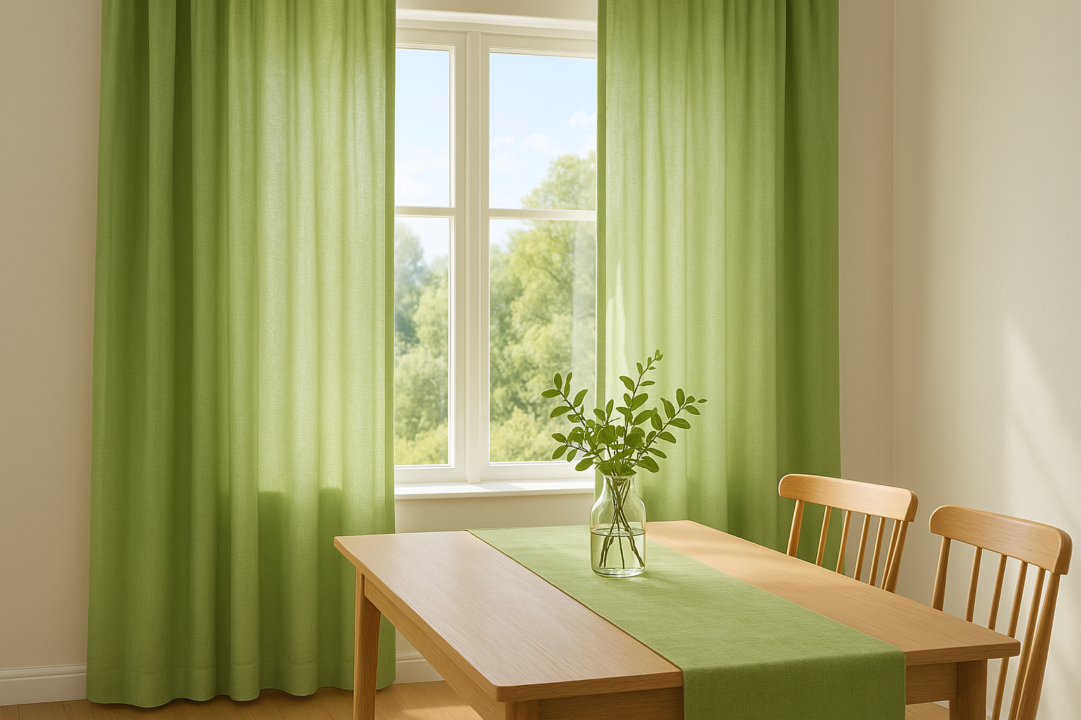 연두색 커튼으로 봄의 자연을 담은 다이닝룸 인테리어