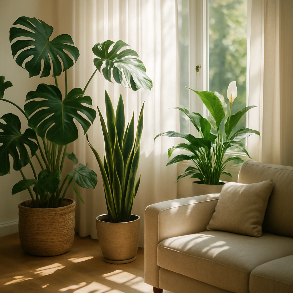 햇살과 잘 어울리는 실내 식물들이 조화를 이루는 거실