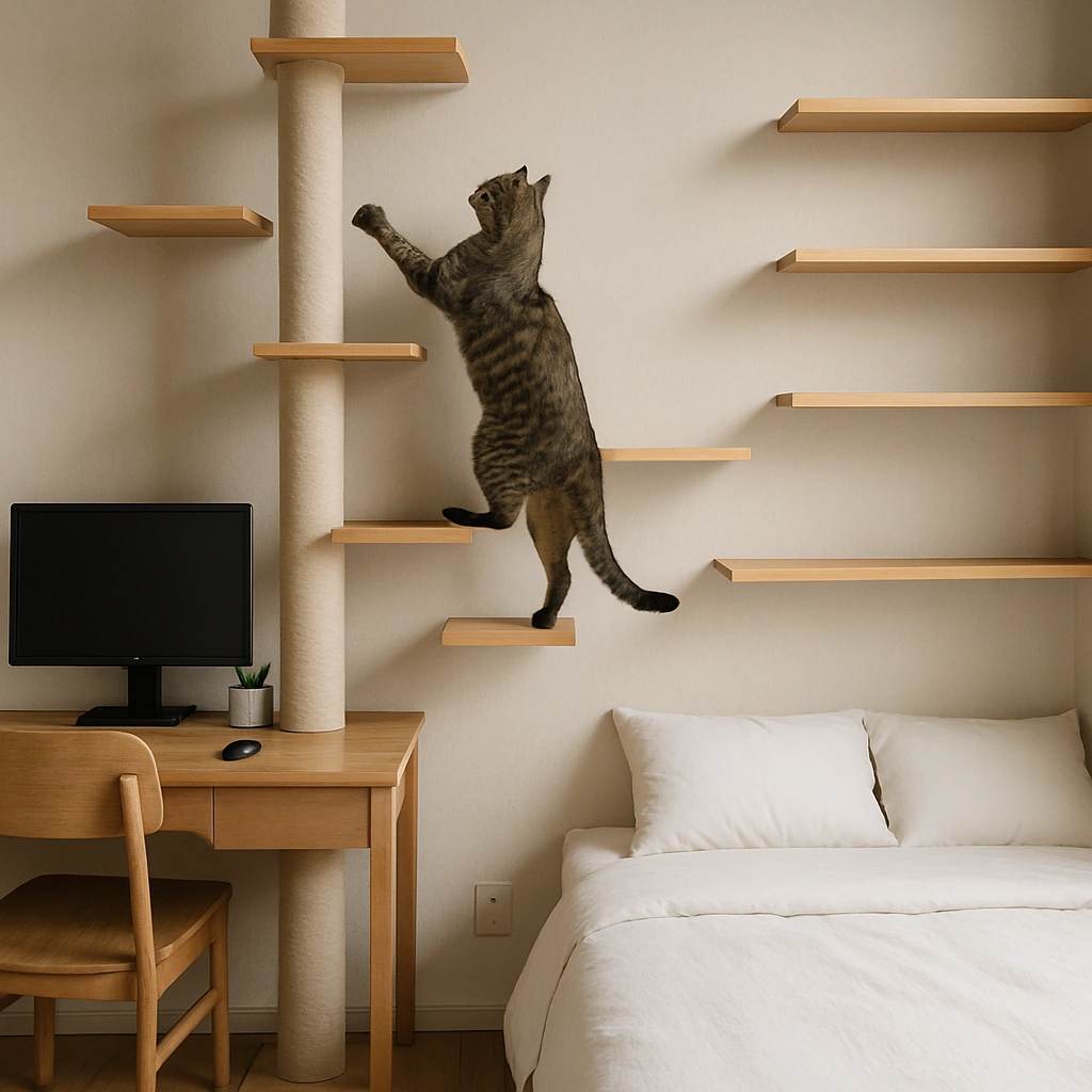 이때 부피가 큰 캣타워보다는 캣폴을 추천해요. 캣폴은 바닥을 차지하는 면적이 훨씬 적으면서도 천장까지 높게 설치할 수 있어 좁은 원룸에 안성맞춤이랍니다. 책상이나 침대처럼 높이가 다른 가구 근처에 설치하면, 고양이가 계단처럼 오르내리며 기존 가구까지 놀이터로 활용하게 만들 수도 있어요.