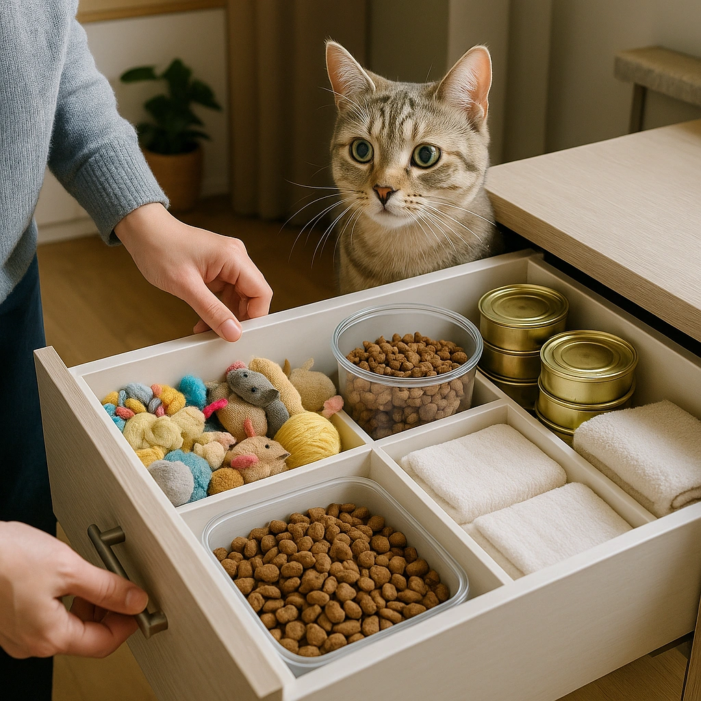 고양이 용품은 생각보다 자리를 많이 차지하죠. 사료, 간식, 모래, 장난감, 약품까지… 깔끔하게 정리하려면 별도의 수납 공간 확보가 필수예요.