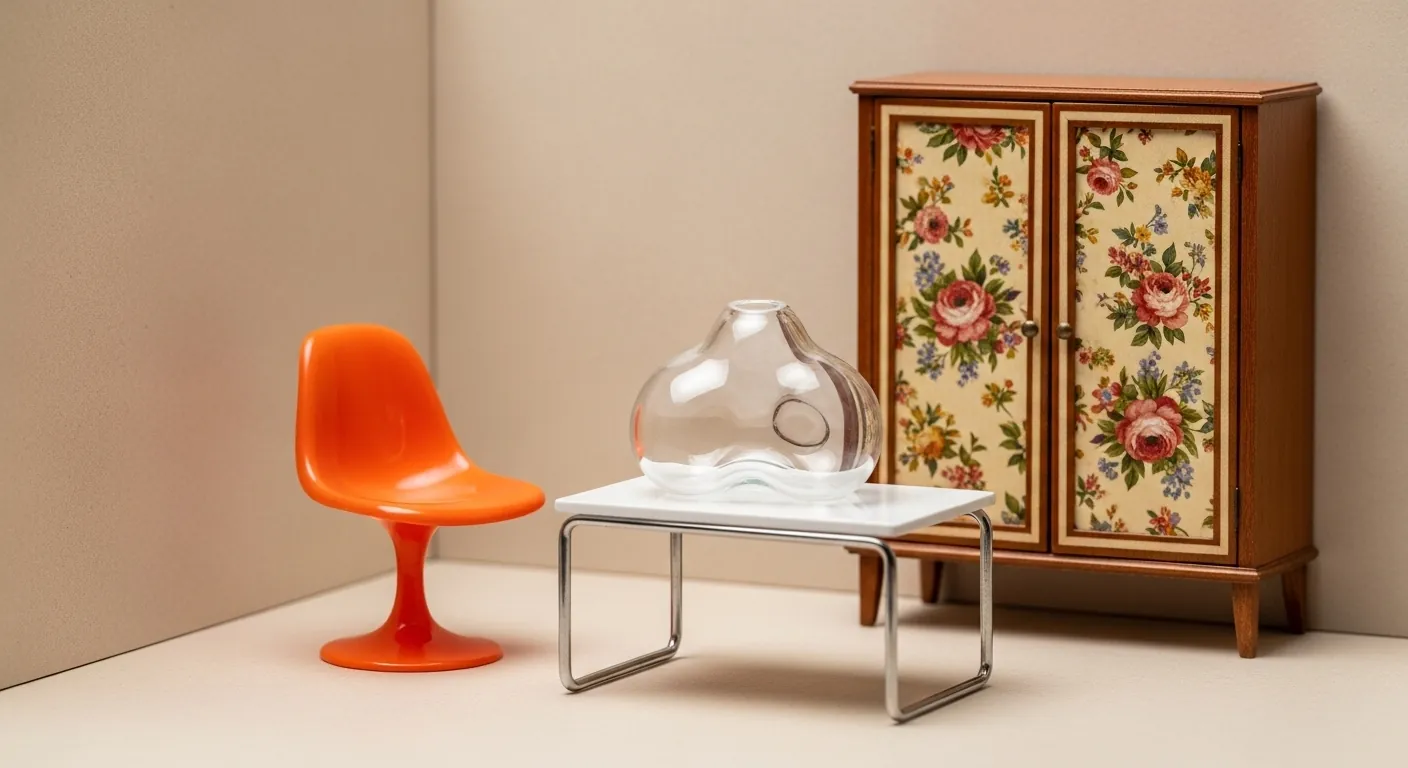 예를 들어, 오렌지색 70년대 플라스틱 테이블 위에 2025년 유기적인 블롭 형태의 유리 화병을 놓는 식이죠. 진짜 힙해요!