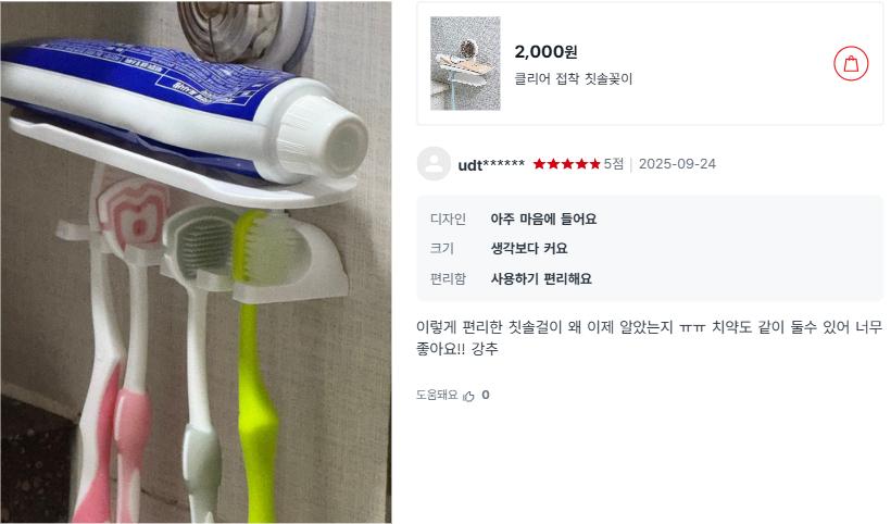 • 칫솔&치약의 위생적인 독립: 칫솔은 '흡착 칫솔꽂이'로 하나씩, 치약은 '치약걸이'에 걸어 위생적으로 분리해주세요. 여기에 작은 사치, '튜브 짜개'를 더하면 비싼 치약과 클렌징폼을 마지막 한 방울까지 알뜰하게 쓸 수 있답니다.
