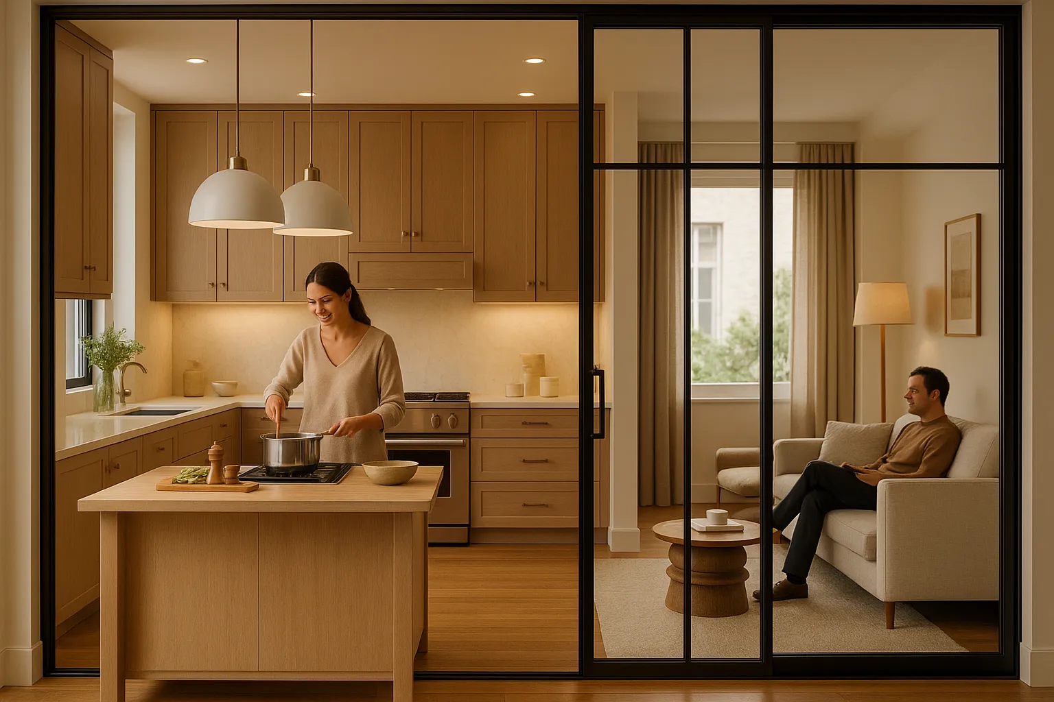 개방감은 유지하되, 필요할 때 냄새와 소음을 완벽하게 차단하는 '슬라이딩 중문'이나 '유리 파티션'을 설치하는 것이죠. 평소에는 문을 활짝 열어두어 대면형 주방처럼 사용하다가, 냄새나 소음이 심한 요리를 할 때만 닫으면 됩니다. 이것이야말로 한국식 라이프스타일에 최적화된 `실용적인 주방 구조`가 아닐까 싶습니다.