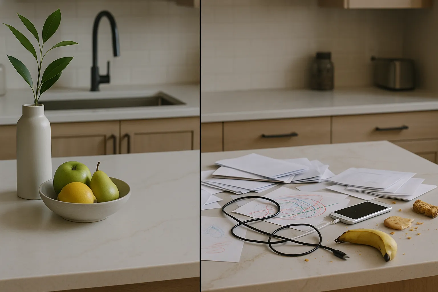 - 가족 규칙 정하기: 아일랜드 위는 '제로 존(Zero Zone)'으로 선포하고, 각자 물건은 지정된 자리에 두는 규칙을 만드세요.