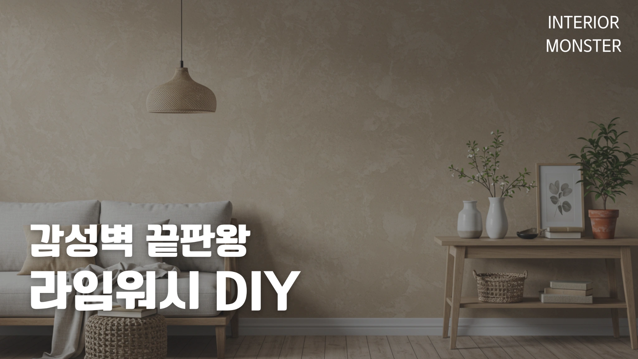 베이지톤 라임워시 텍스처 벽과 내추럴한 우드 가구, 식물과 오브제가 어우러진 감성적인 거실 인테리어에 '감성벽 끝판왕 라임워시 DIY' 문구가 강조된 이미지