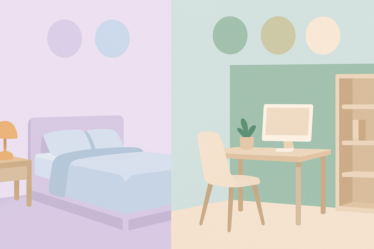 라벤더·연블루 침실과 세이지 그린·베이지 작업 공간을 나란히 보여주는 마음 편안 컬러 인포그래픽