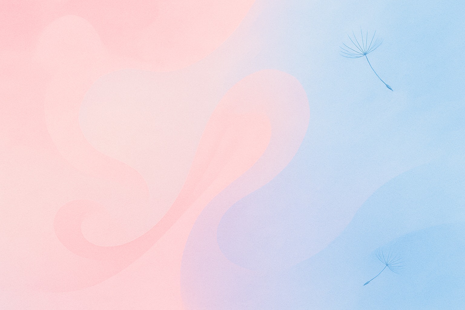 파스텔 핑크와 블루가 부드럽게 이어지는 추상 그라데이션 배경 위에 민들레 홀씨가 흩날리는 차분한 느낌의 일러스트
