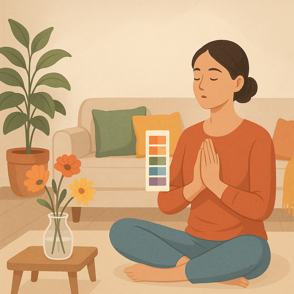 컬러 테라피 실천 일러스트 – 거실에서 색상 스와치 바라보며 호흡 명상하는 여성, 쿠션·담요·식물·꽃으로 포인트 컬러 배치