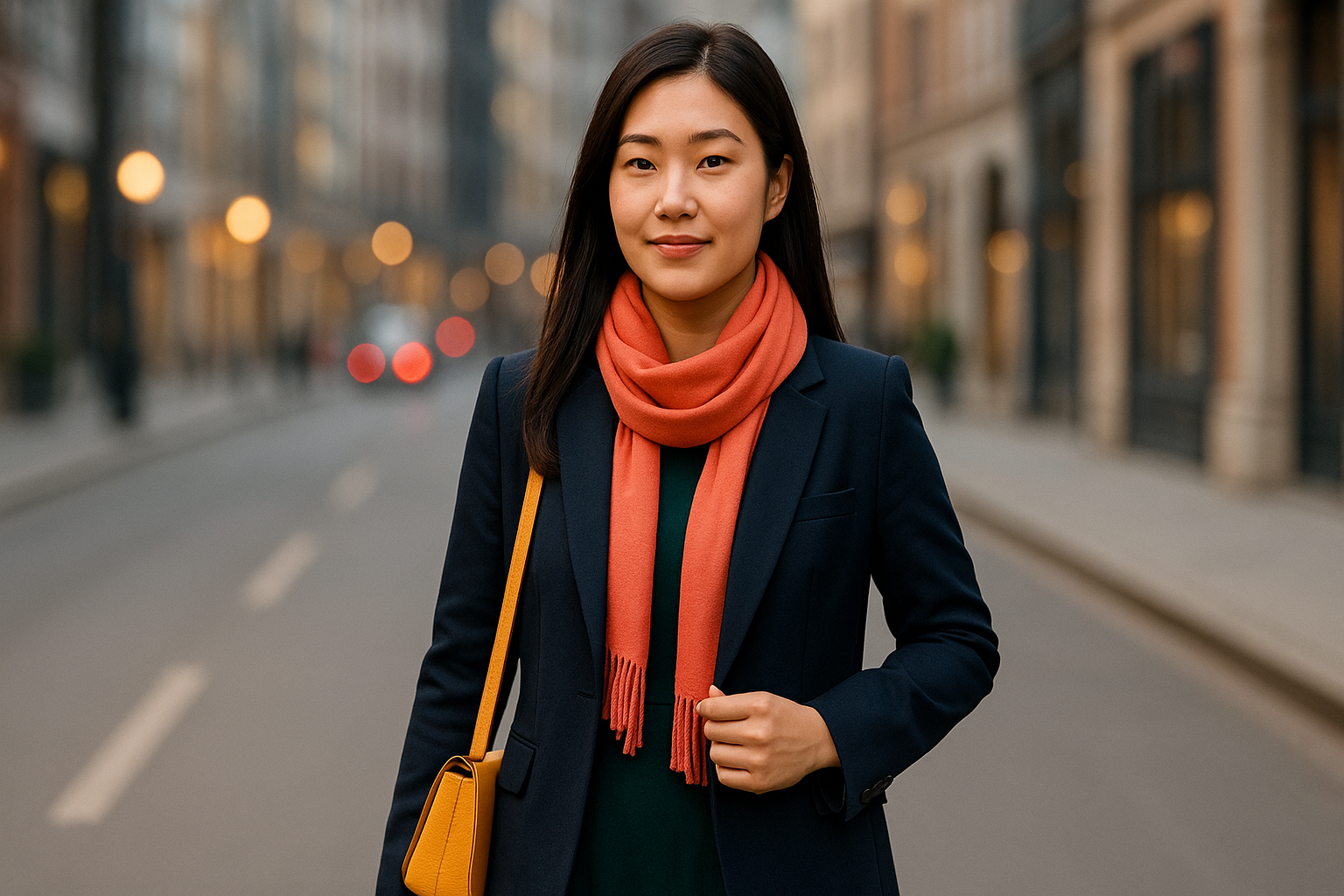 네이비 블레이저와 다크 그린 원피스 위에 코럴 스카프와 머스터드 옐로우 가방을 매치한 한국인 여성, 16:9 비율의 시티 스트리트 패션—안정과 생기를 모두 담은 컬러 테라피 룩