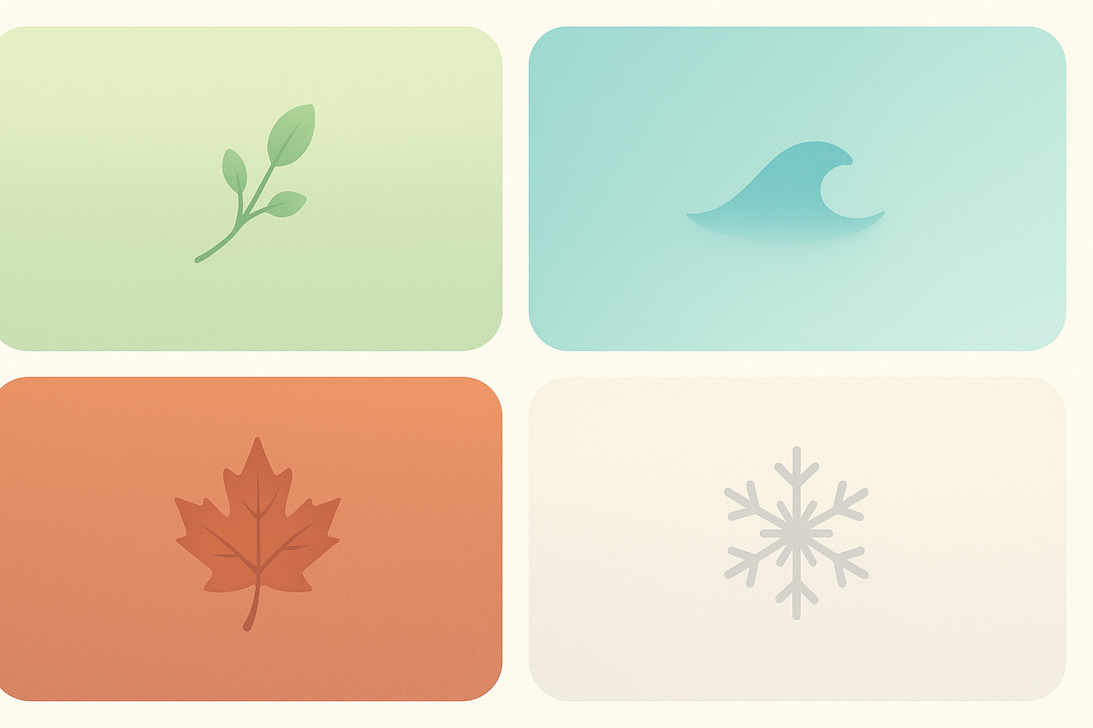 계절별 마음 안정 컬러 인포그래픽 – 봄 연한 그린 잎, 여름 민트빛 파도, 가을 테라코타 단풍, 겨울 크림·라이트 그레이 눈송이