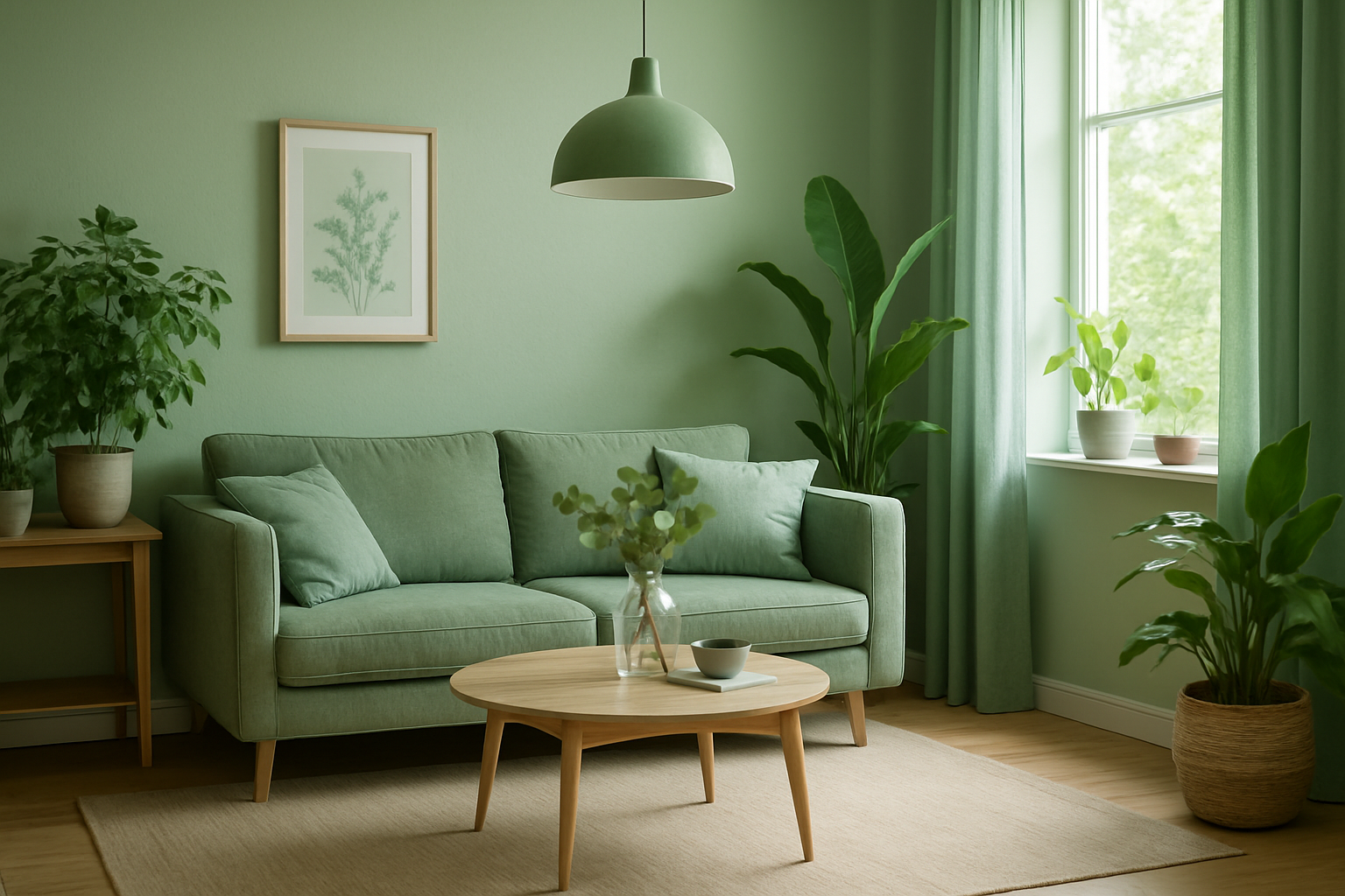 편안한 민트·세이지 그린 톤의 거실 인테리어, 관엽식물과 자연광이 어우러진 치유 공간