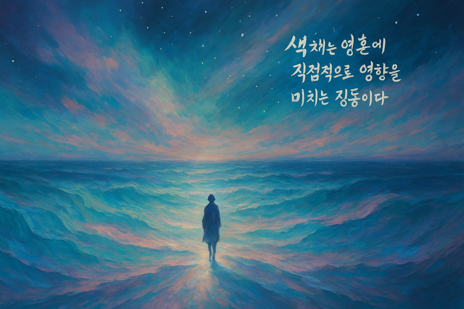 몽환적인 푸른 바다와 별빛 하늘, 작은 여행자가 서 있는 일러스트 “색채는 영혼에 직접적으로 영향을 미치는 진동이다” 한글 캘리그래피 포함
