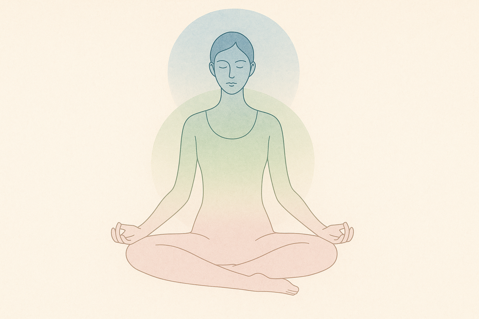 연한 베이지 배경 위, 블루·그린·핑크 세 겹의 오라 속에서 명상 자세로 앉아 있는 사람의 미니멀 선 드로잉