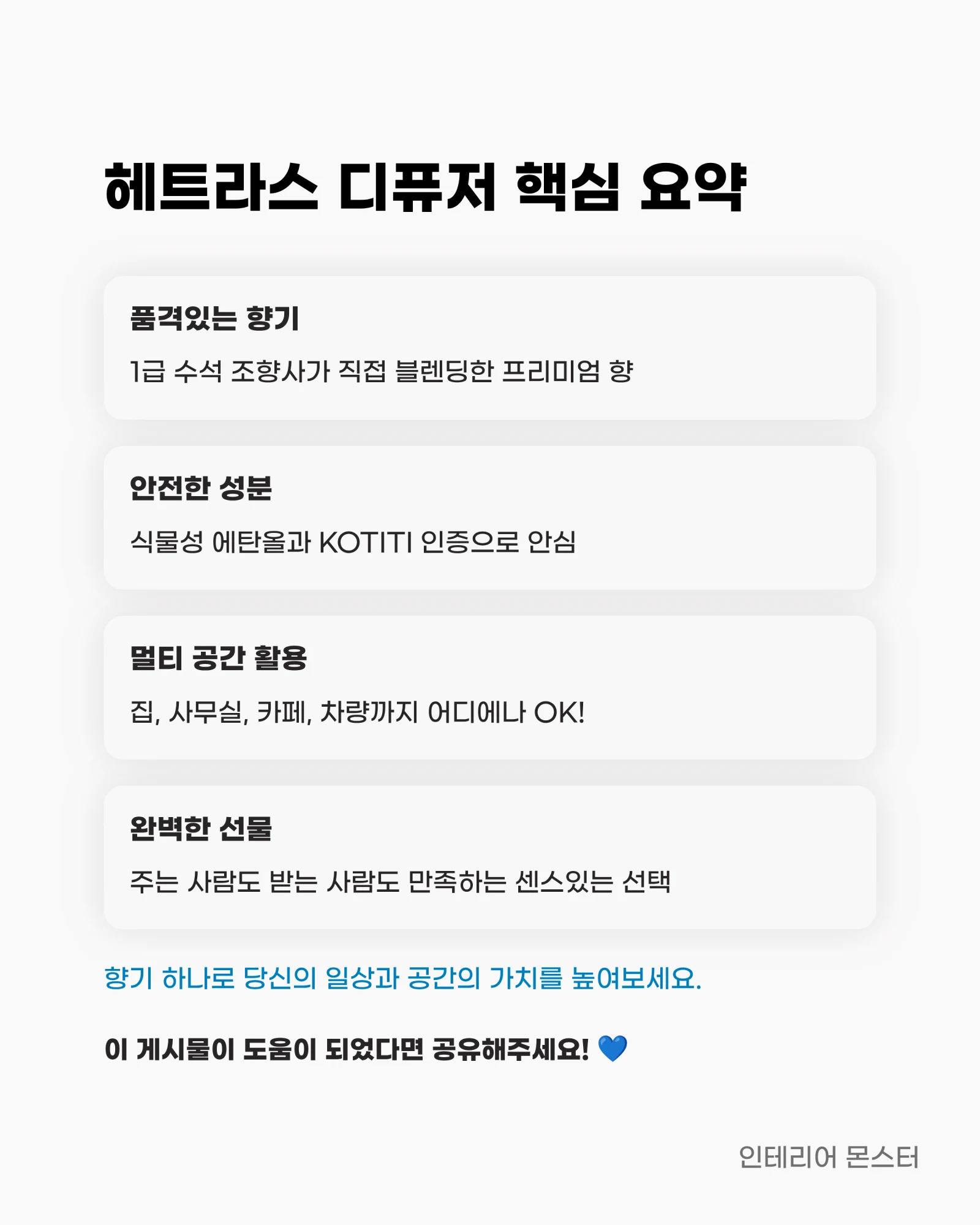 오늘은 이렇게 공간의 품격을 높여주는 헤트라스 프리미엄 디퓨저에 대해 자세히 알아봤어요. 향기 하나만으로도 일상이 얼마나 풍요로워질 수 있는지 경험해보시면 좋을 것 같아요.