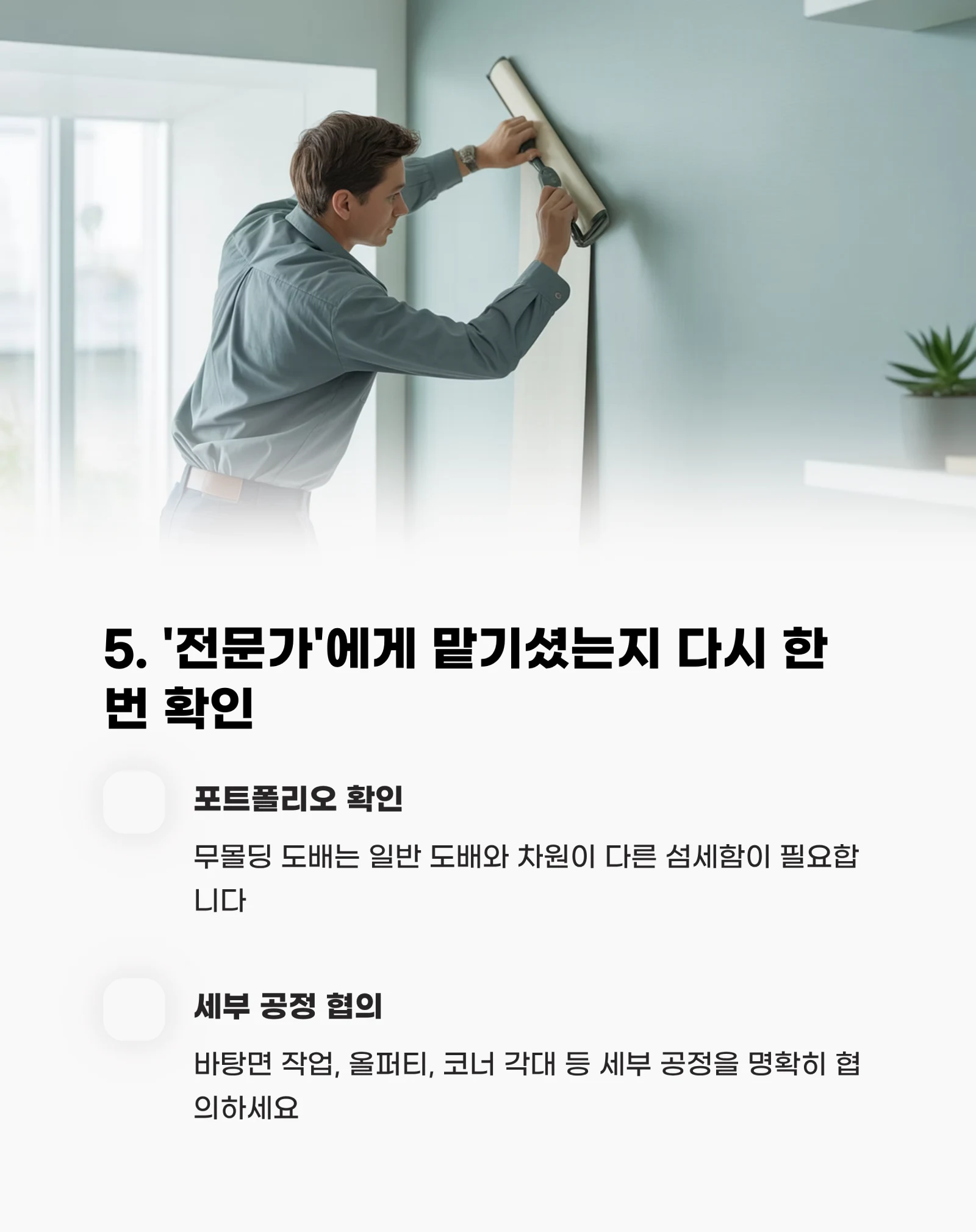 시공팀을 고를 때, 반드시 무몰딩 도배 포트폴리오를 확인하세요. 그들이 직접 시공한 사진이나 후기를 꼼꼼히 살펴보는 게 중요합니다.