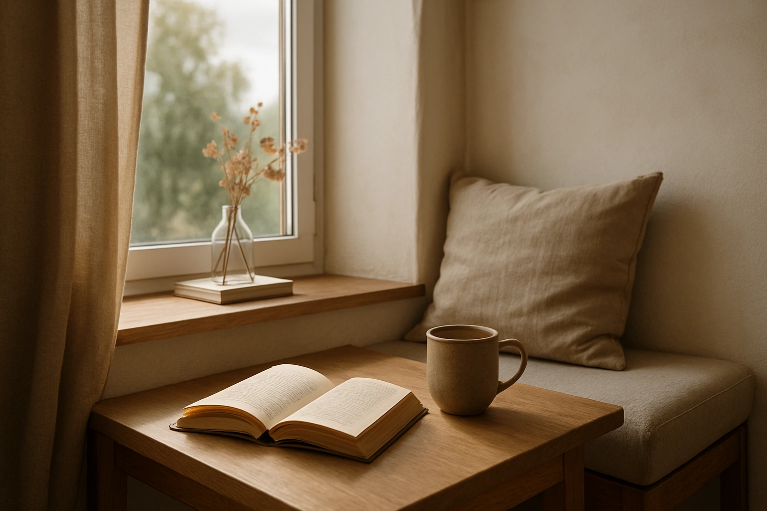 조용한 창가에서 책과 차를 즐기는 미니멀한 공간