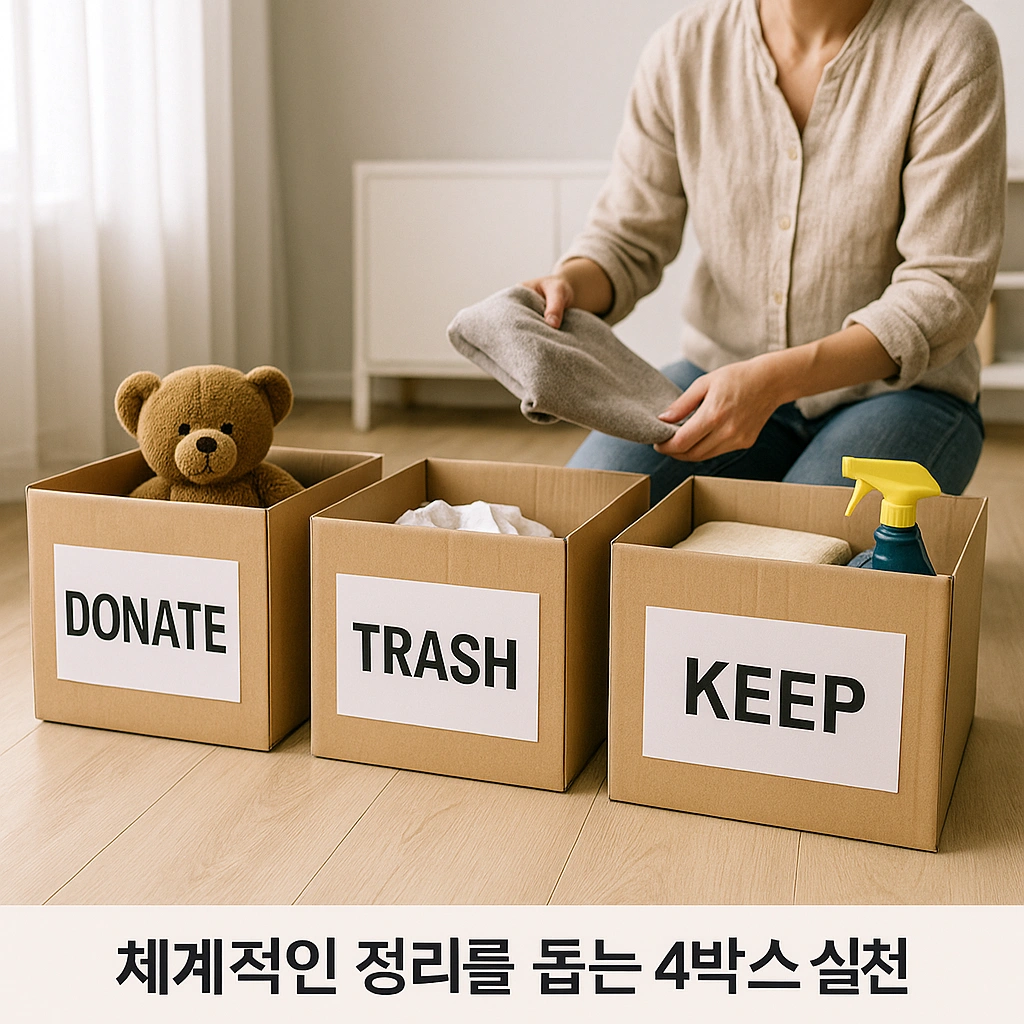 '4박스 법칙'은 물건을 버릴 것, 기부/나눔 할 것, 보관할 것, 사용할 것으로 나누어 체계적으로 정리하도록 도와주죠. 또, 집 전체를 한 번에 정리하려고 하기보다 옷장 서랍 하나, 책상 위처럼 작은 공간부터 시작하는 것이 꾸준히 실천하는 데 효과적이에요.