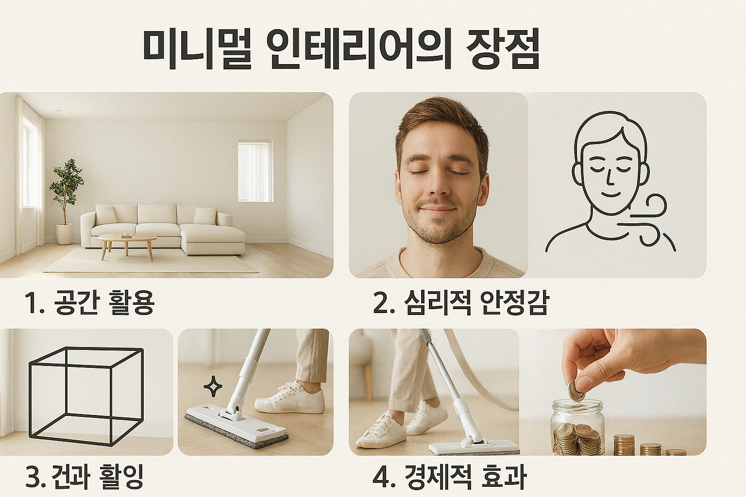 미니멀 인테리어의 4가지 주요 장점 - 공간 활용, 심리적 안정감, 청소와 관리 용이성, 경제적 효과를 보여주는 인포그래픽
