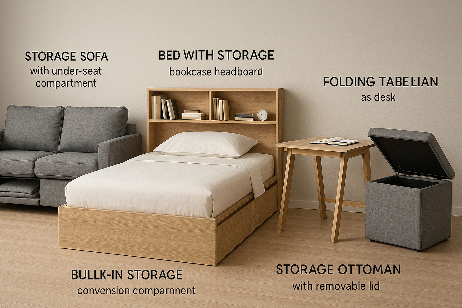 작은 공간을 위한 다기능 가구 컬렉션 - 수납 소파, 책장 침대, 접이식 식탁, 수납 스툴 등 공간 절약 솔루션