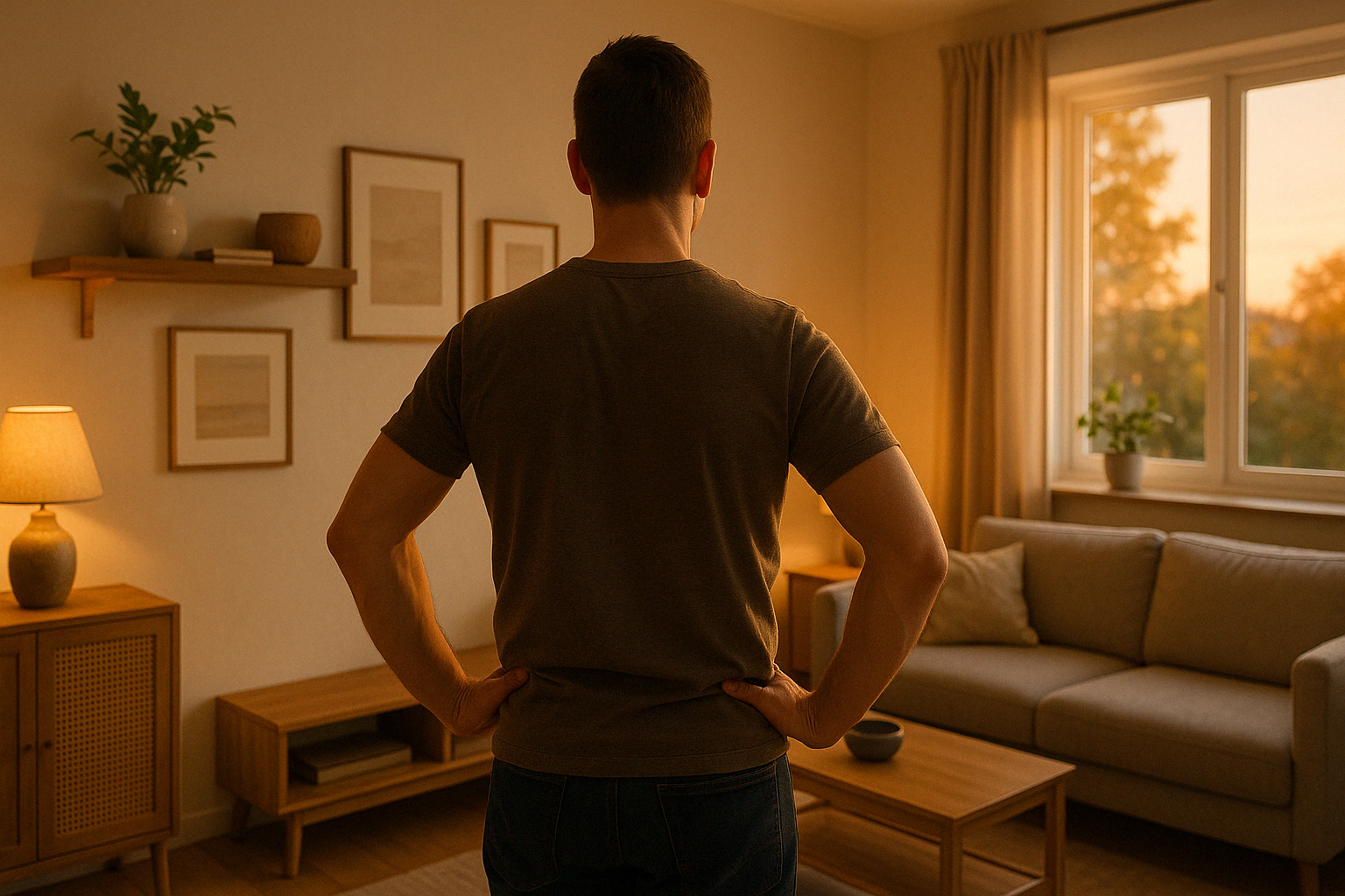 직접 완성한 인테리어 공간을 바라보며 성취감을 느끼는 모습을 담은 감성적인 이미지