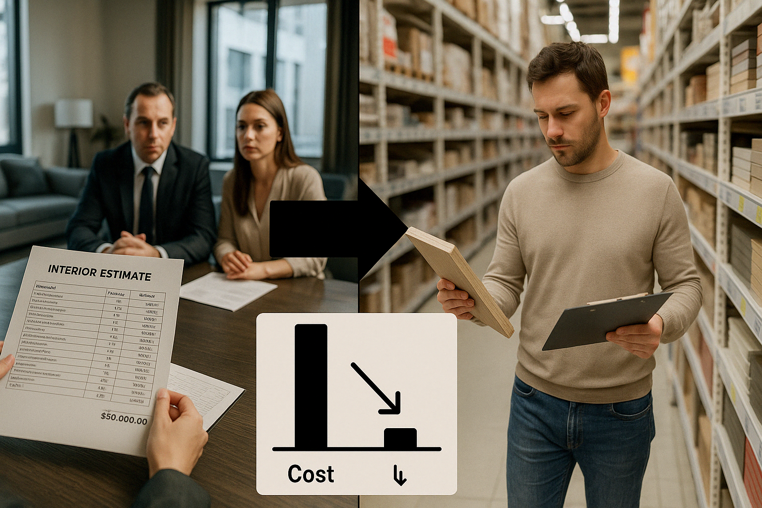 턴키 인테리어와 반셀프 인테리어의 비용 차이를 시각적으로 비교하는 이미지