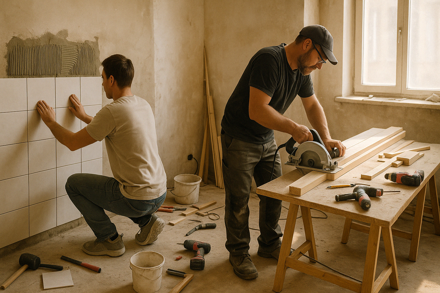 반셀프 인테리어 현장에서 직접 작업 중인 모습과 전문가와 협업하는 모습을 보여주는 사실적인 이미지