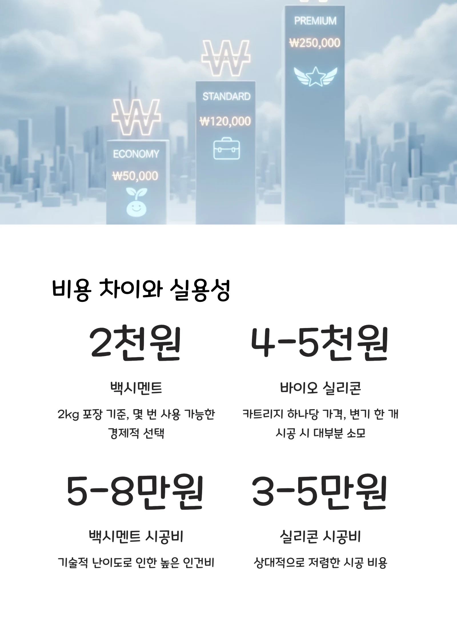 바이오 실리콘은 카트리지 하나당 4,000~5,000원 정도예요. 변기 한 개 시공하면 대부분 사용하게 되니까, 시공 한 번당 비용으로 보면 백시멘트의 2배 정도라고 보시면 돼요.