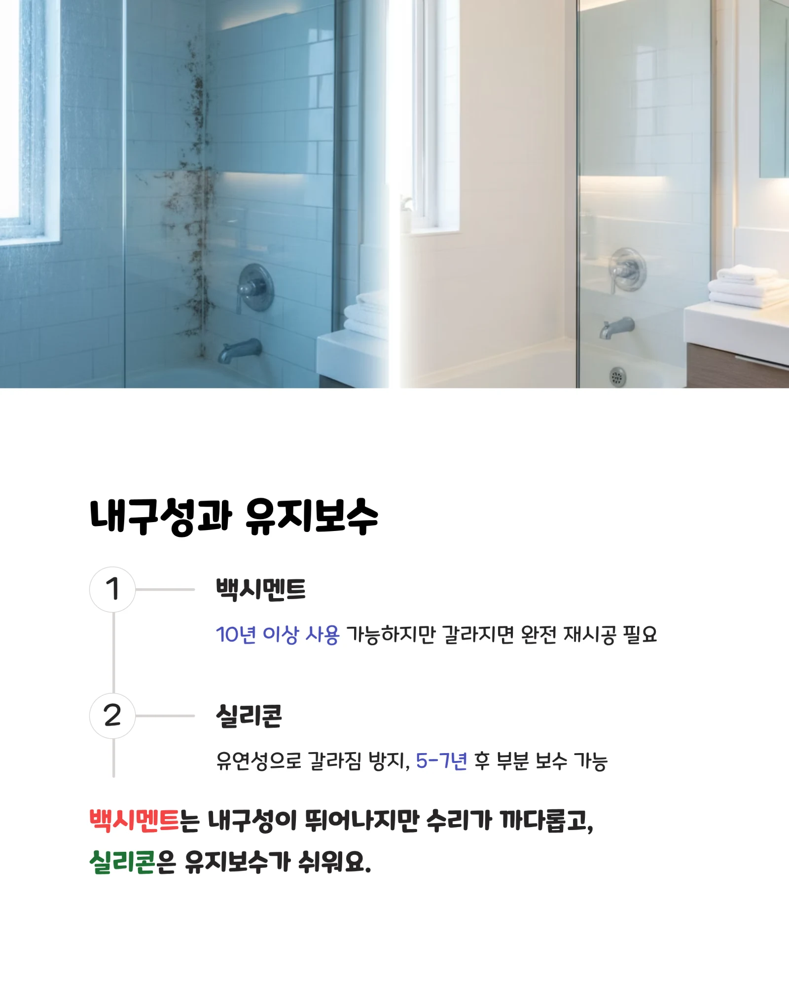 사실 둘 다 장단점이 뚜렷해서 정답은 없다고 생각해요. 내 상황에 맞는 선택이 최선의 선택이죠. 급하게 해결해야 한다면 실리콘, 오래 살 집이라면 백시멘트. 간단명료하지만 실용적인 기준이에요.