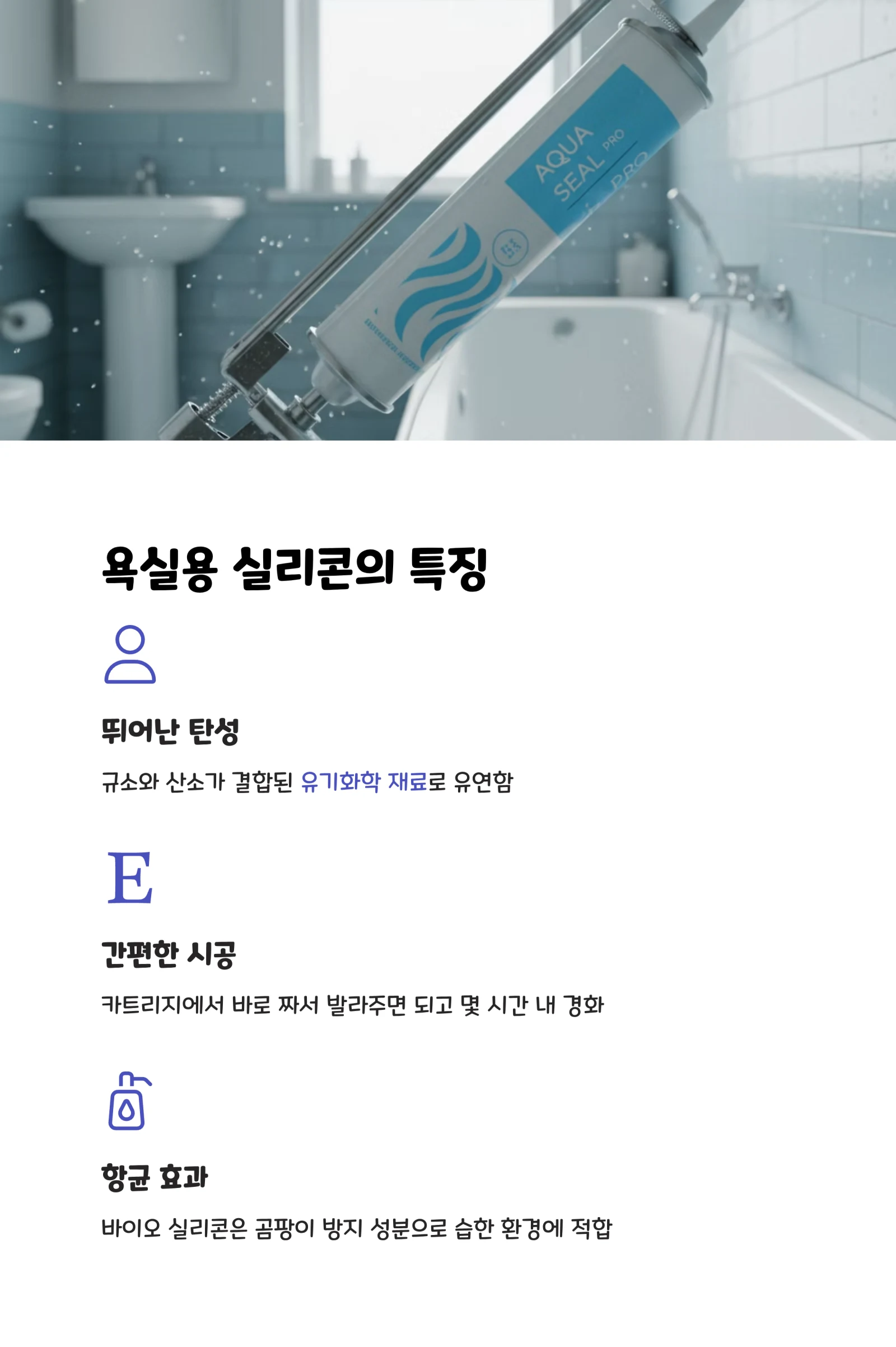 실리콘은 규소와 산소가 결합된 유기화학 재료로, 탄성이 뛰어난 것이 가장 큰 특징입니다. 특히 바이오 실리콘은 곰팡이 방지 성분이 들어있어서 습한 욕실 환경에 적합해요.