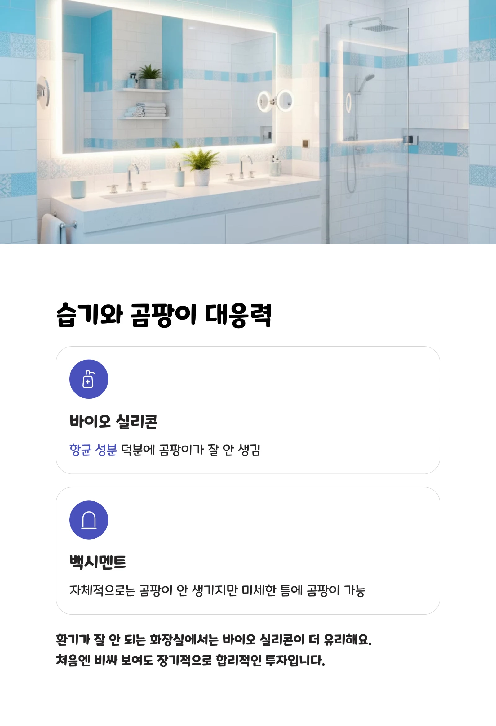 욕실은 항상 습한 환경이잖아요. 이런 조건에서는 바이오 실리콘이 확실히 유리해요. 항균 성분 덕분에 곰팡이가 잘 안 생기거든요.