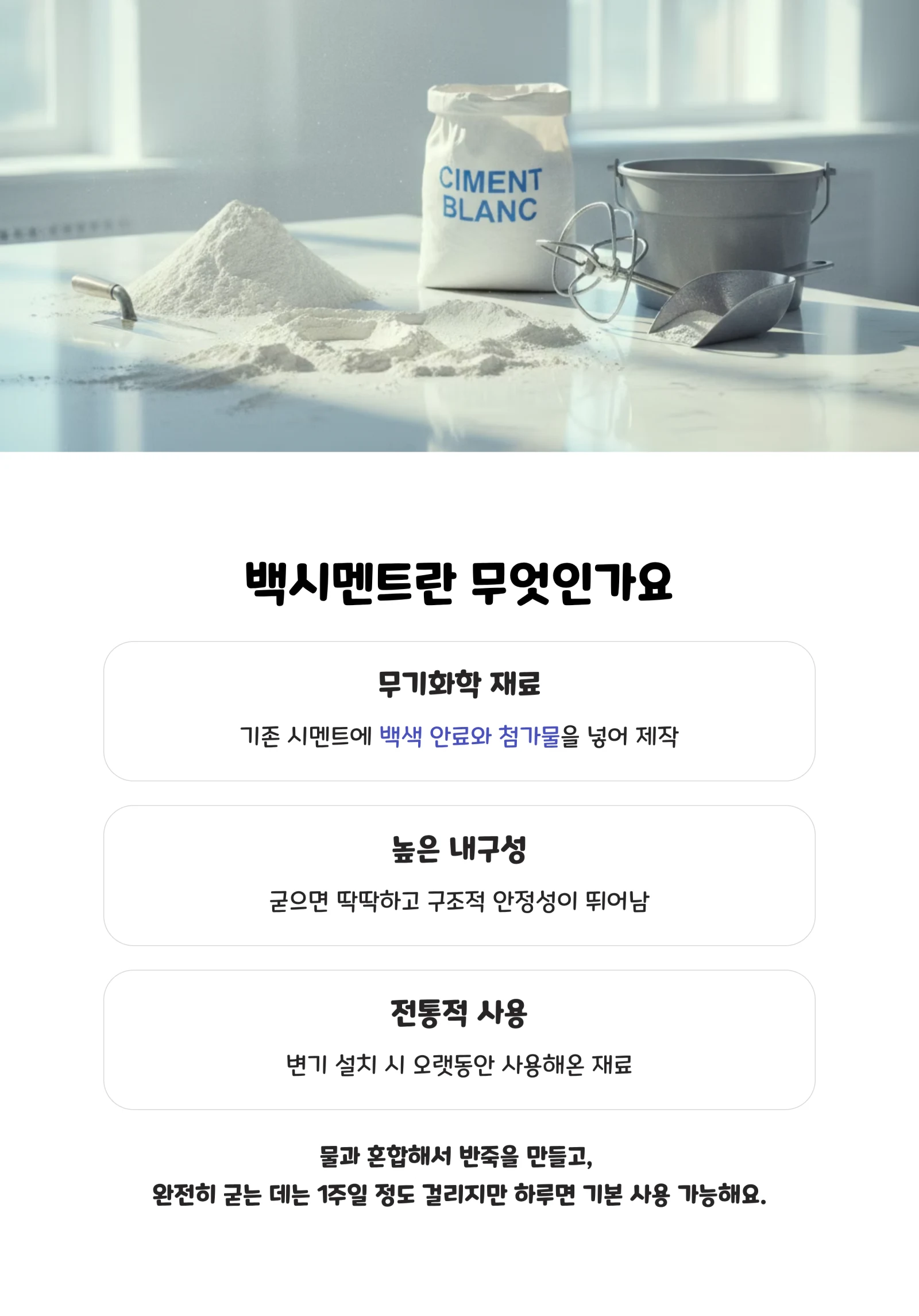 백시멘트는 기존 시멘트에 백색 안료와 여러 첨가물을 넣어 만든 무기화학 재료입니다. 시멘트 특성상 굳으면 딱딱하고 변형이 어려워요. 하지만 그만큼 내구성이 뛰어나고 구조적 안정성이 좋다는 장점이 있습니다.