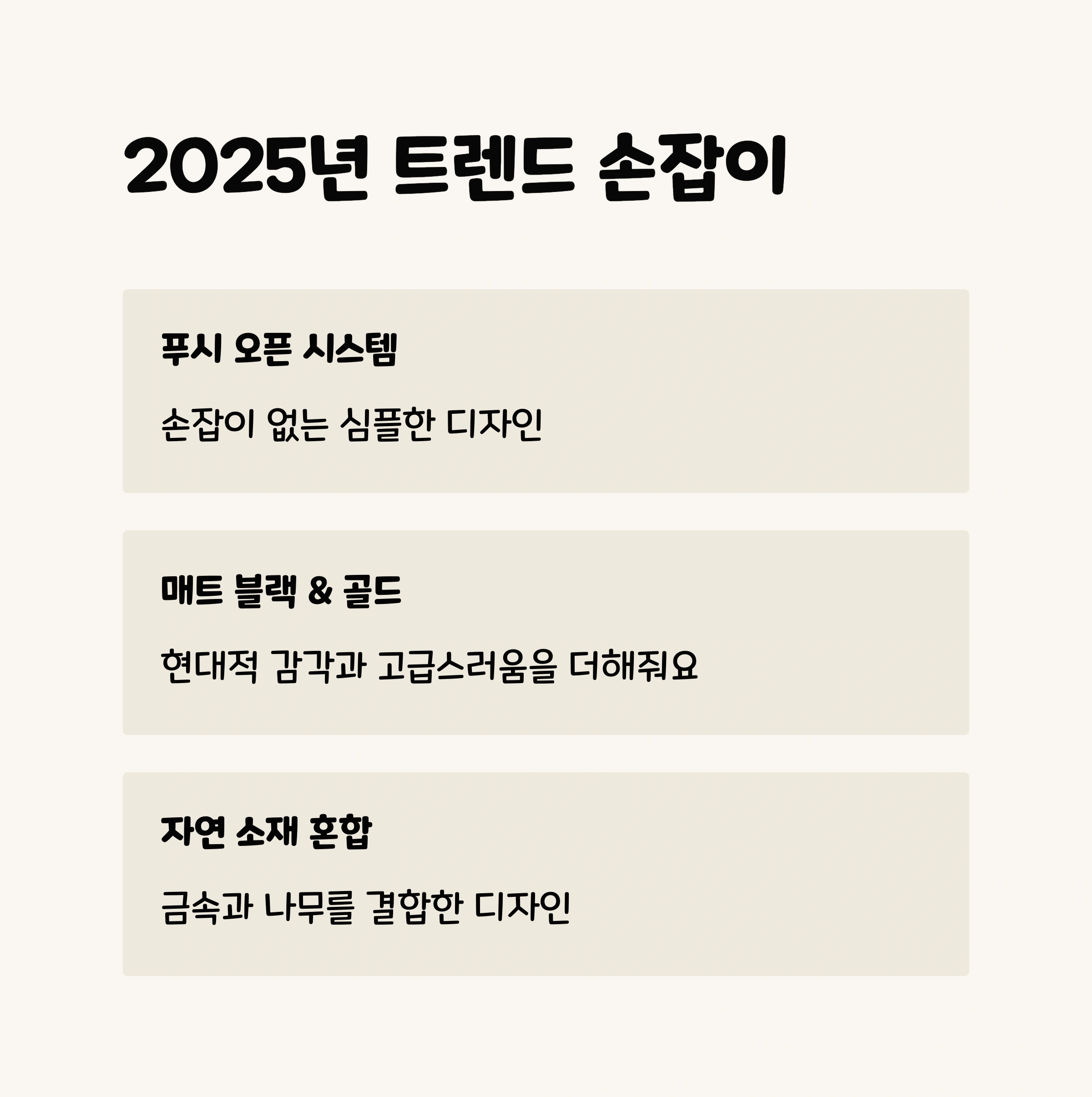 | 히든형 | 손잡이가 외부로 드러나지 않는 형태 | 미니멀한 공간, 심플한 모던 스타일 |