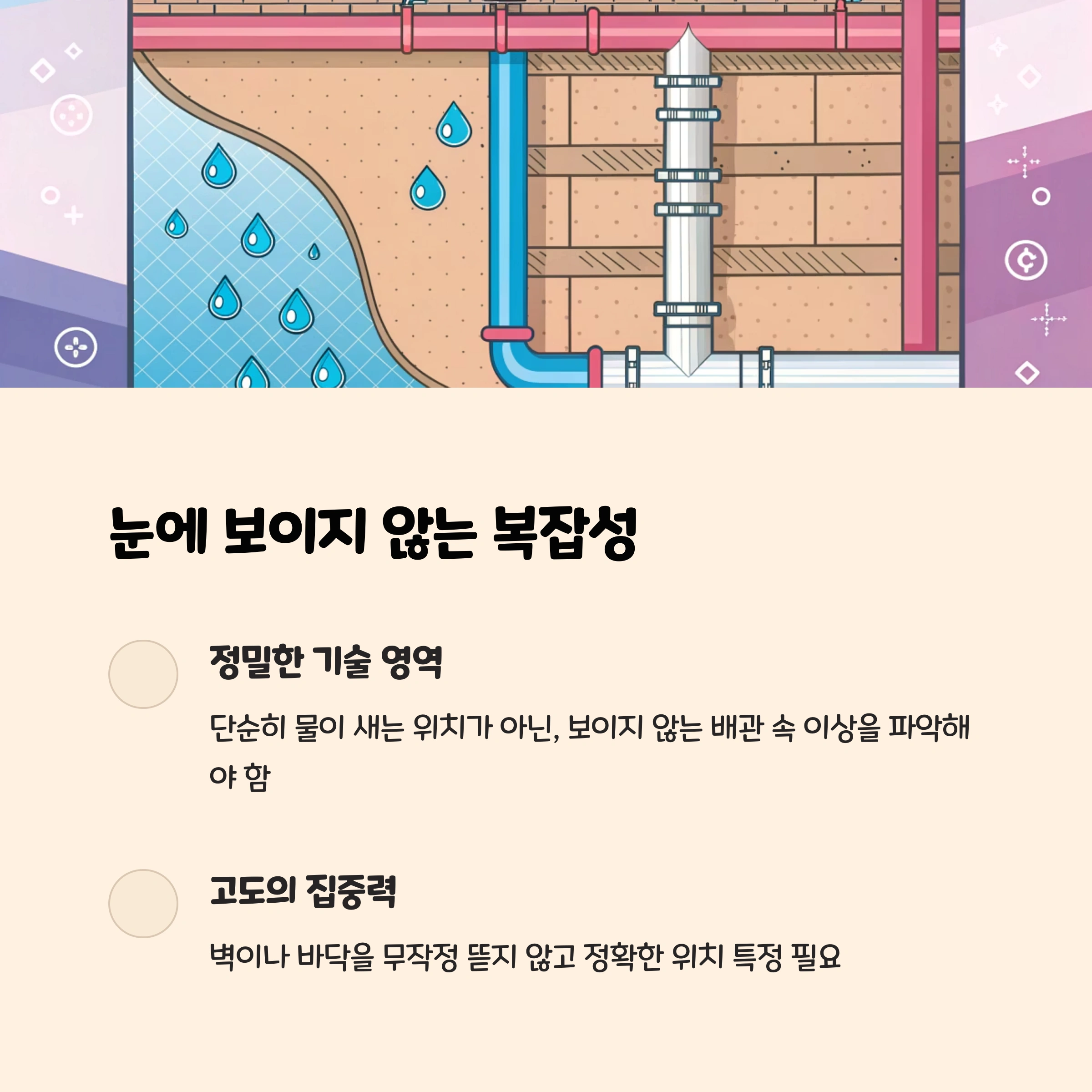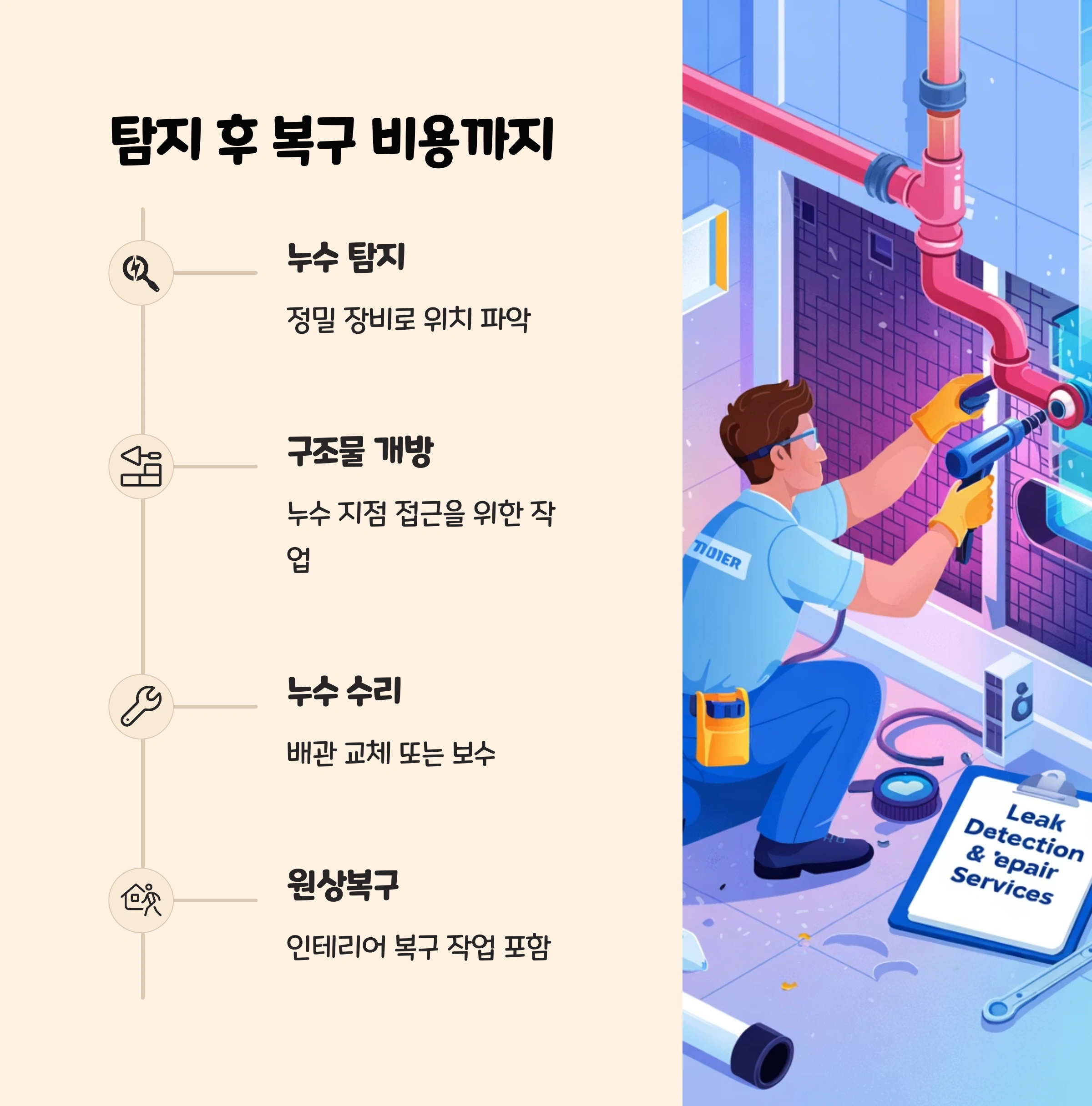 잘못된 위치를 뜯었다가 누수가 없는 곳을 파손하거나, 누수를 제대로 해결하지 못할 수 있기 때문이죠.