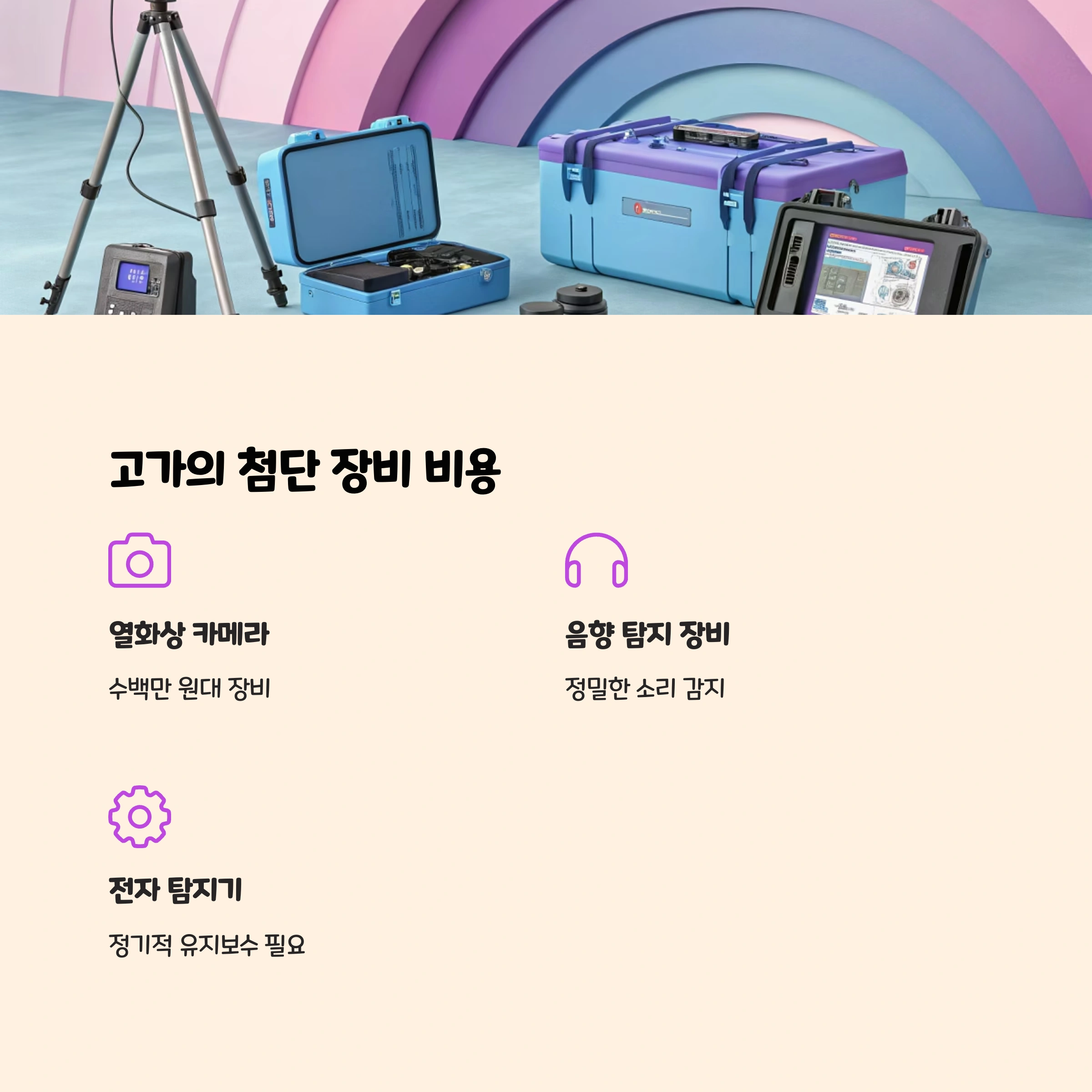 열화상 카메라, 음향 탐지 장비, 전자 탐지기 등 첨단 장비들이 필요하며, 이 장비들은 모두 수백만 원에서 수천만 원에 달할 수 있어요.