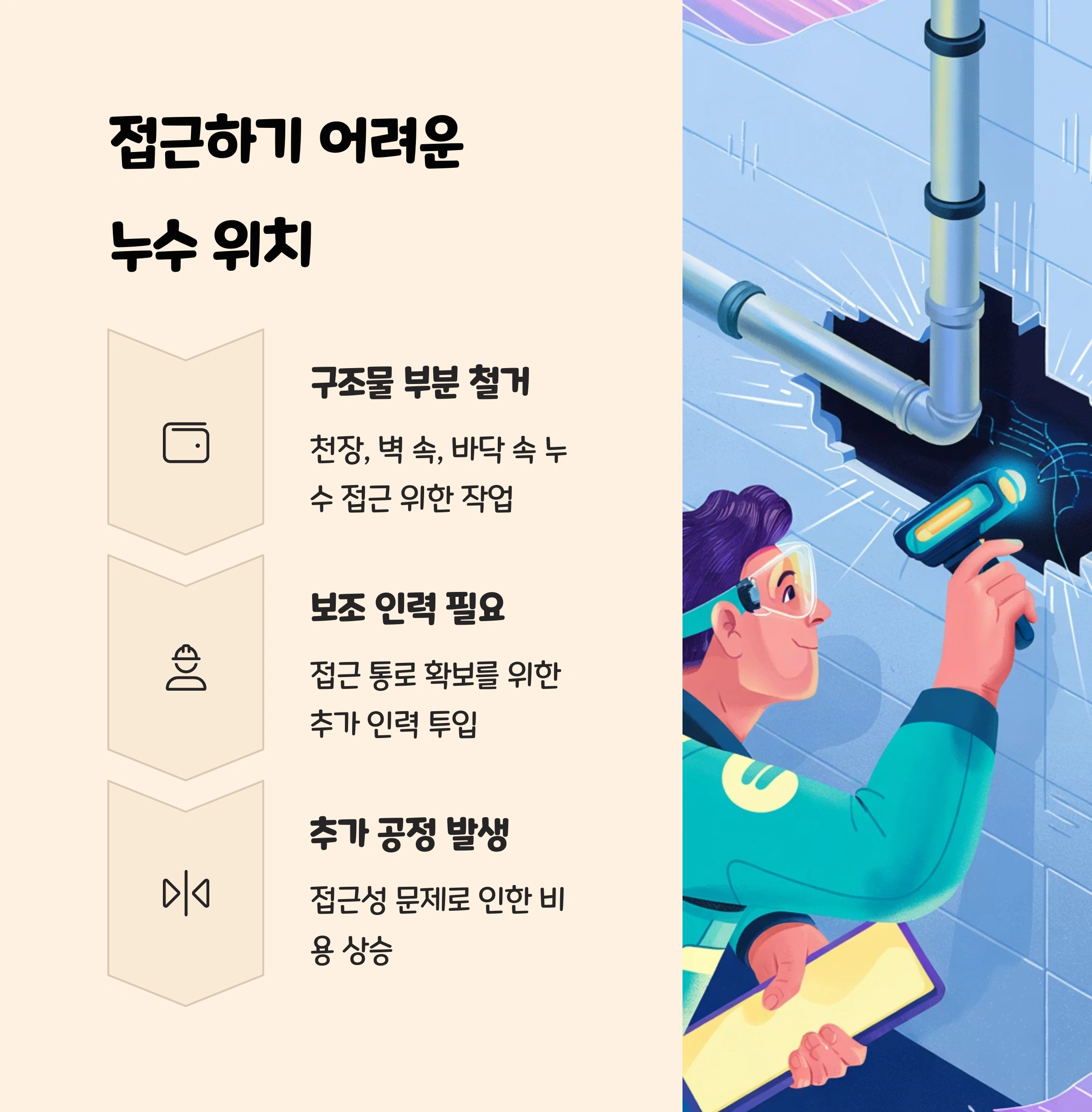 잘못된 위치를 뜯었다가 누수가 없는 곳을 파손하거나, 누수를 제대로 해결하지 못할 수 있기 때문이죠.