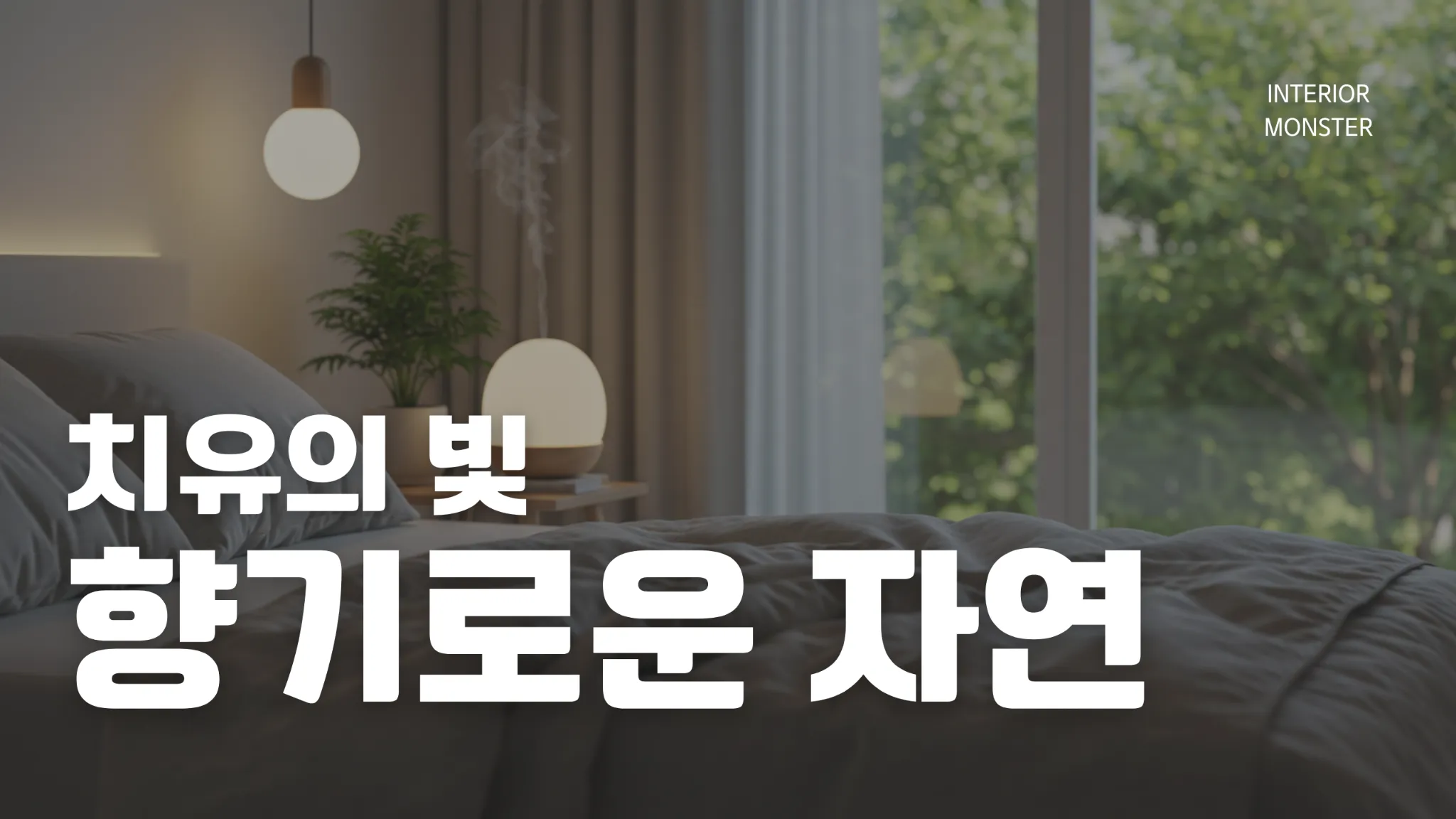 햇살 가득한 침실과 조명, 아로마 디퓨저가 조화를 이루는 공간에 ‘치유의 빛, 향기로운 자연’이라는 문구가 담긴 감성 인테리어 썸네일