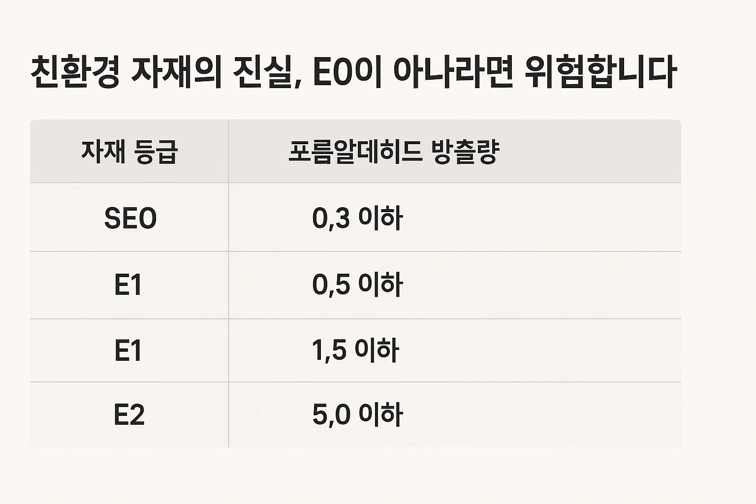 제가 분석한 바로는, 많은 업체들이 E1 등급 자재를 사용하면서도 '친환경'이라고 광고하는 경우가 비일비재합니다. 아래 표를 보시고 그 차이를 명확히 인지하셔야 합니다.