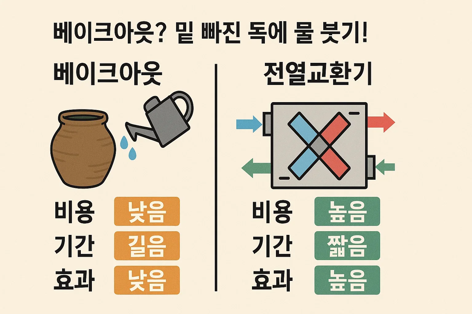 몇 번의 베이크아웃으로 잠시 수치가 낮아질 수는 있어도, 근본 원인인 저급 자재가 그대로 있는 한 독성 가스는 다시 차오를 수밖에 없습니다. 시간과 난방비만 낭비할 수 있다는 뜻입니다.