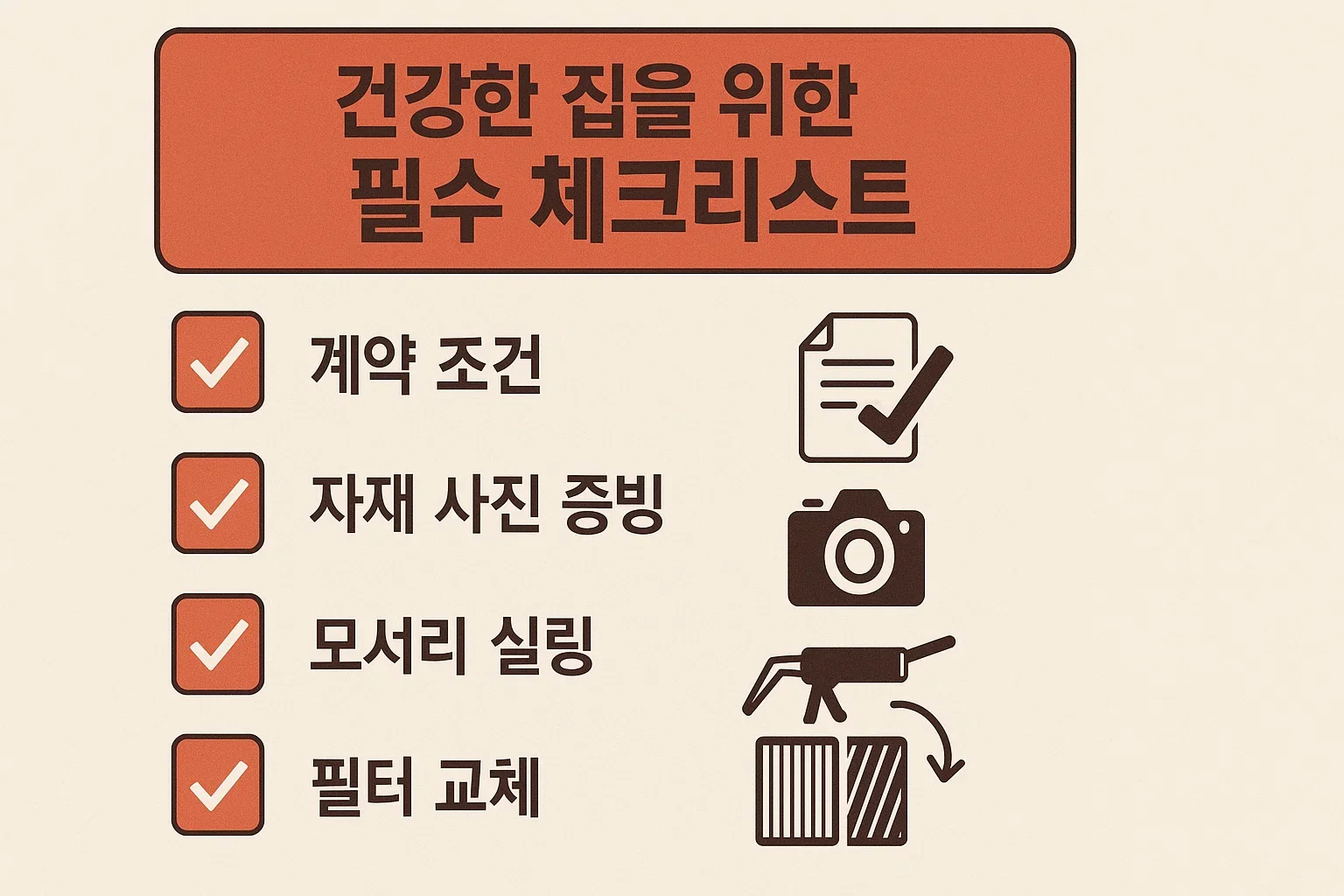 - 환기 시스템 점검: 입주 즉시 전열교환기 필터부터 확인하고, 필요시 교체하세요. 이후 최소 하루 2~3회, 2시간씩이라도 꾸준히 가동하는 습관을 들여야 합니다.