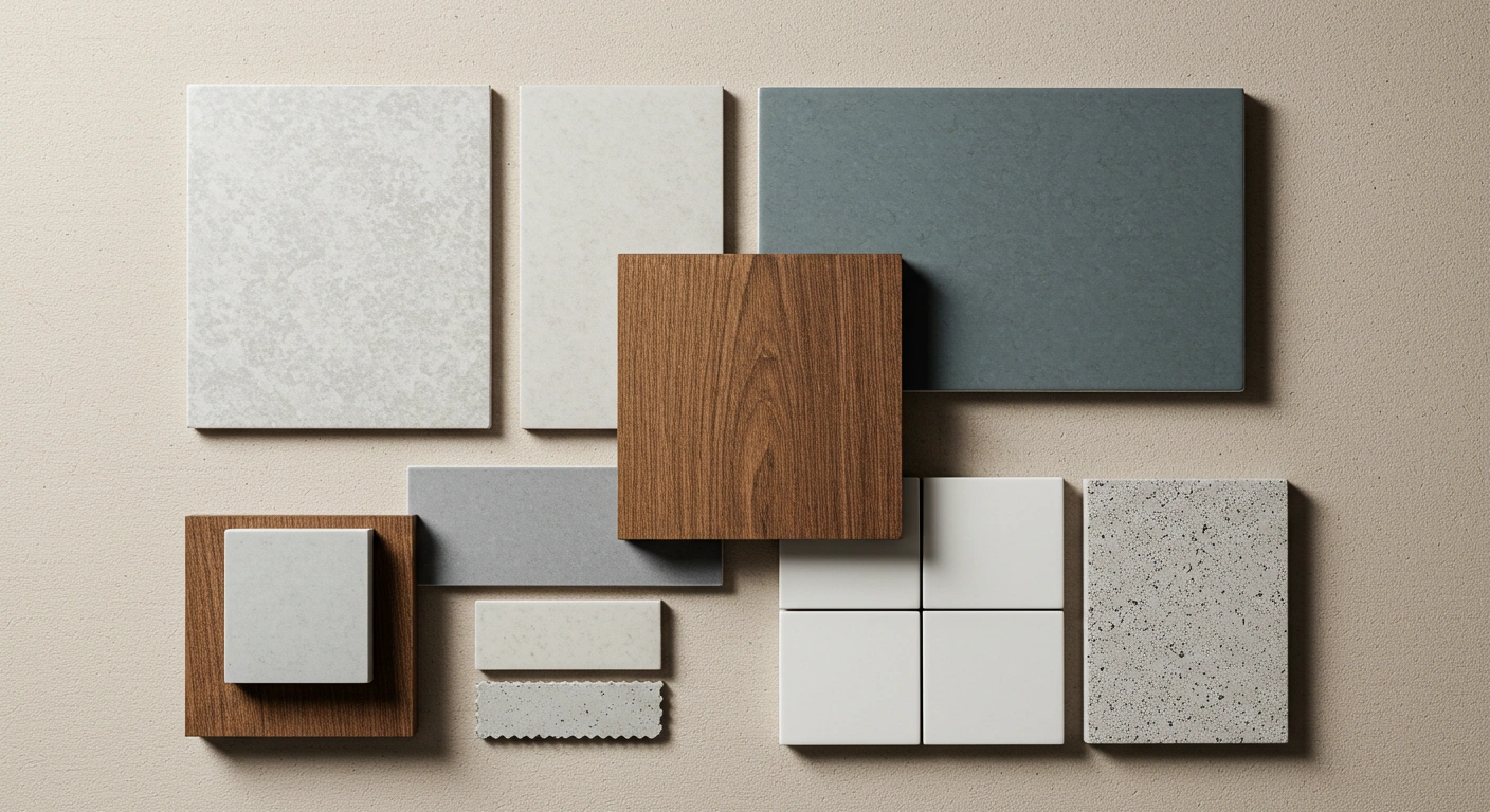 다양한 색상과 질감의 세라믹 및 우드톤 자재 샘플들이 조화롭게 배치된 플랫 레이 이미지. 1:1 비율.