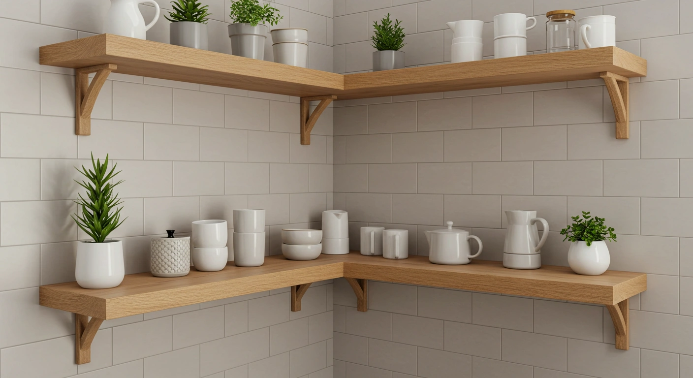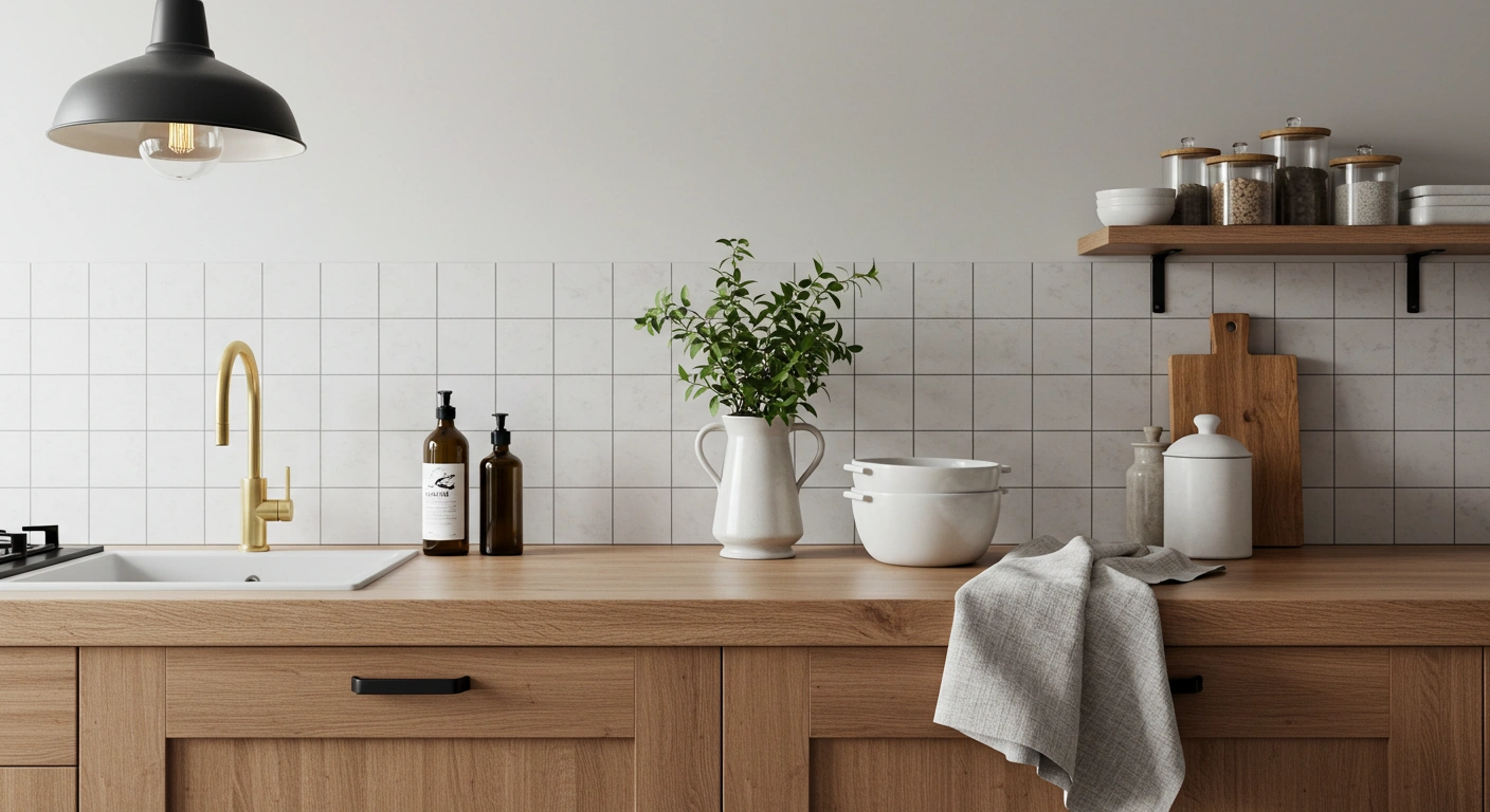 2. 세라믹 타일 벽면 + 우드 선반: 감성 한 스푼!