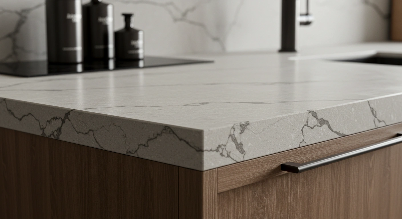 세라믹 상판의 고급스러운 질감과 우드톤 하부장의 따뜻한 나뭇결이 대비되는 디테일 클로즈업 이미지. 1:1 비율.