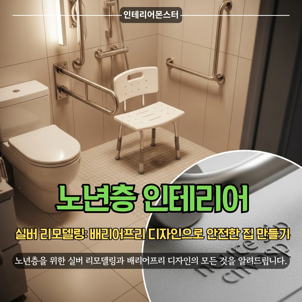 안전손잡이 설치는 필수입니다. 변기 양쪽과 샤워부스 벽면에 스테인리스 재질의 손잡이를 설치하면 앉고 일어서는 동작이 훨씬 안전해져요.