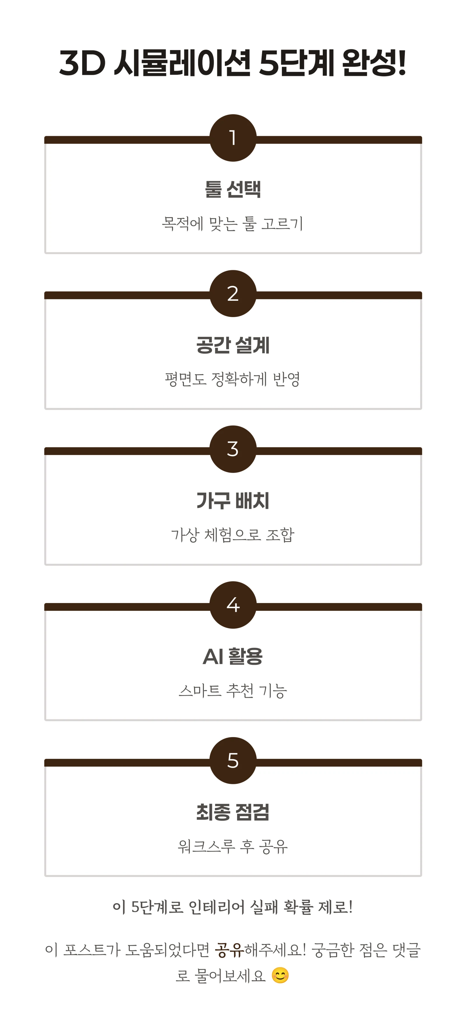 3D 인테리어 시뮬레이션 5단계(툴 선택, 공간 설계, 가구 배치, AI 활용, 최종 점검) 요약 이미지