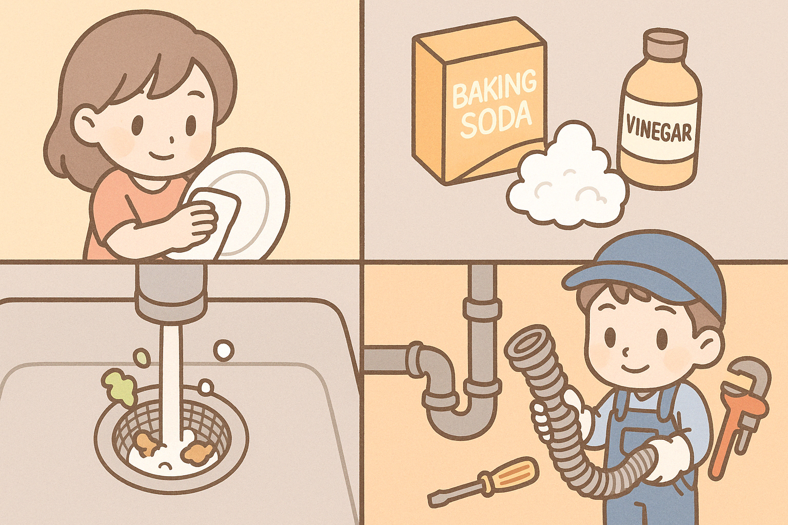 설거지할 때 기름기가 많은 음식은 키친타월로 먼저 닦아내는 습관을 들이는 게 좋아요. 뜨거운 물에 중성세제를 풀어서 정기적으로 배수관을 청소해주는 것도 좋은 방법이에요.